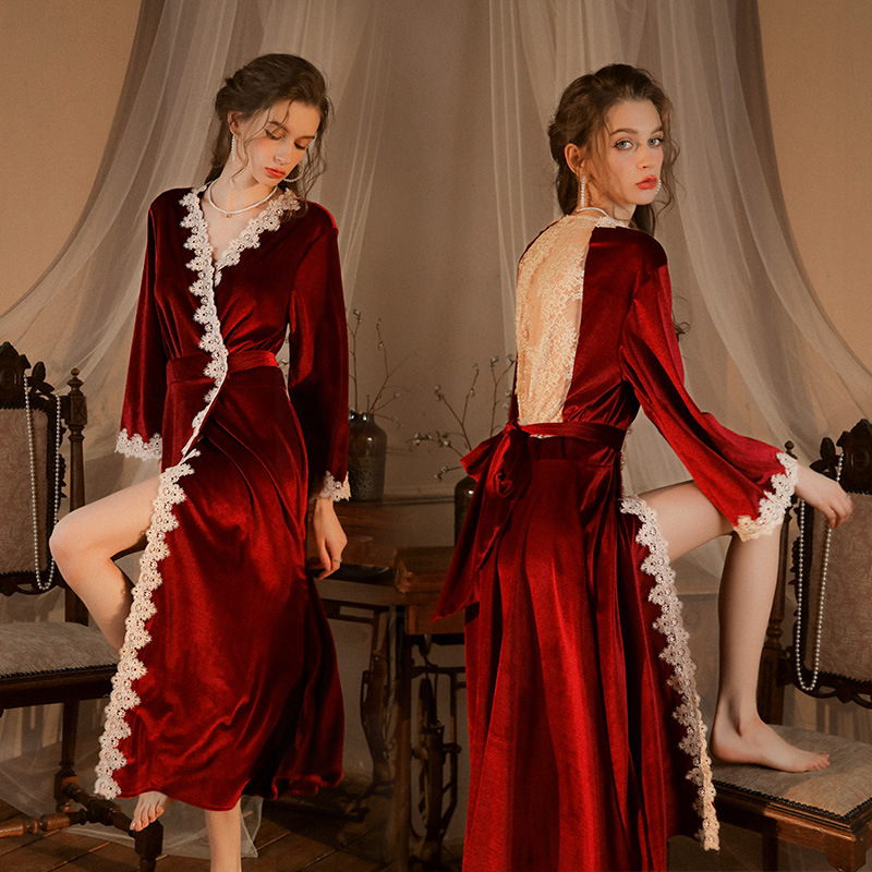 Полое кружевное утреннее платье Женская Невеста Золотая бархатная удлиненная ночная рубашка Весна и осень Свадебная красная ночная рубашка Пижама