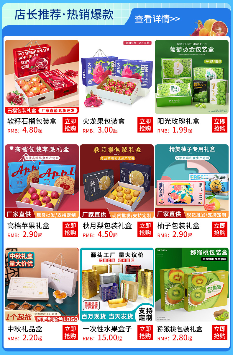 Яблоко 9; Фрукт №7; Подарочная коробка «Рай свежих фруктов»; Фрукты №18; Апельсин 12 большой; Фрукт №26; Фрукты №29; Фрукты №28; Общий 2323; Яблоко 2501; Общий 2428; Подарочная коробка с свежими фруктами павлина; Фрукт №3 (оконный тип); Фрукт 27 маленький; Фрукт 27 Большой; Общий 2316; Общий 2503; Общий 2421; Общий 2513; Подарочная коробка с фруктами 02; Общий 2302; Apple 16 маленький; Общий 2403; Общий 2322; Апельсин 12 маленьких; Общий 2406; Apple 16 Большой; Общий 2502; Подарочная коробка с тиснением горячим тиснением; Универсальная внутренняя коробка 2319.; Универсальный набор 2406.; Яблоко 2402; Оранжевый 2412; Универсальный 2409 пять в одном; Общий 2409 «четыре в одном»; Универсальный набор 2302.; Общий-2316#костюм; Универсальный набор 2502.; Общий 2505; Универсальный набор 2505.; Универсальный набор 2503.; Общий 2508; Общий 2506; Общий ТЫ-2511; Общий ТИ-2510; Общий 2515; Изысканная фиолетовая подарочная коробка; Белая подарочная коробка с высокой крышкой; Тисненая подарочная коробка с горячим тиснением, специальная сумка; Премиальный фиолетовый подарочный набор; Apple 2502 с внутренней поддержкой; Средняя прозрачная сумка (доступна подарочная коробка с тиснением золотой фольгой); Маленькая прозрачная сумка-тоут (доступна белая подарочная коробка с высокой крышкой); Большая прозрачная сумочка (в комплекте фиолетовая бутиковая подарочная коробка); Небесное и земное покрытие, портативная коробка для упаковки фруктов