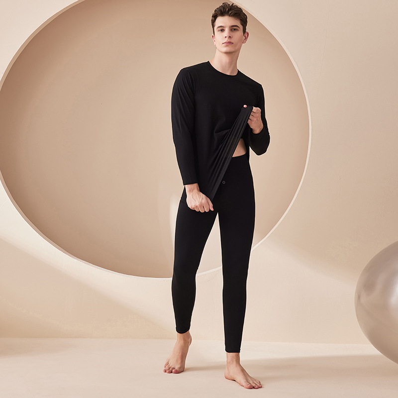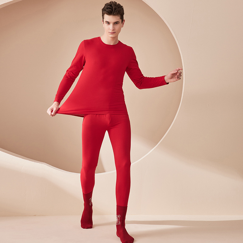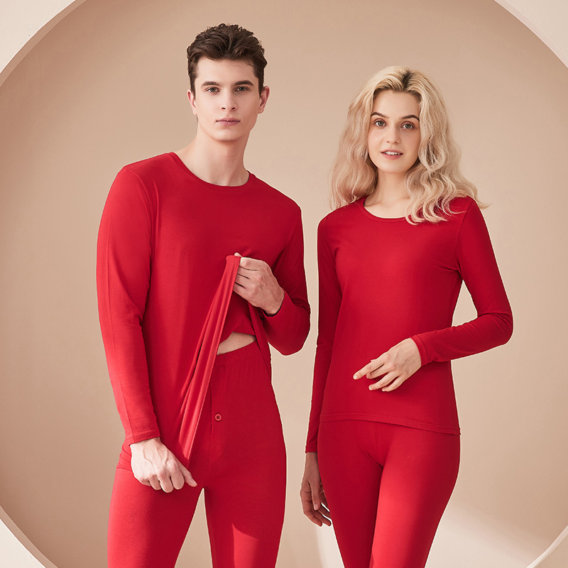 Ярко-красный праздничный комплект термобелья для пары, облегающий и теплый, осенние верх и низ, пуловер с круглым вырезом, утолщенный для сохранения тепла.