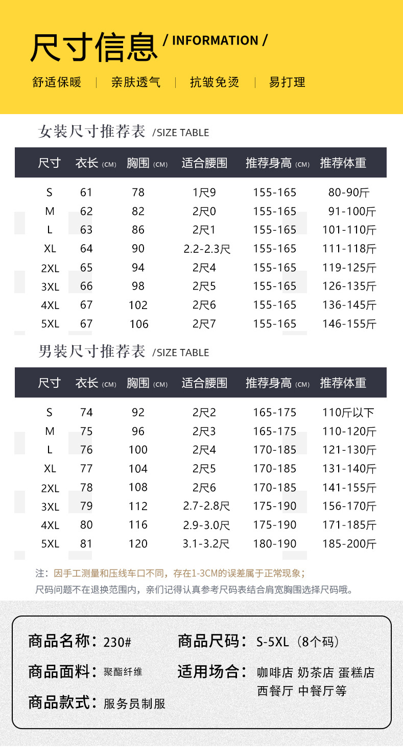 Женская белая рубашка с длинными рукавами 38 юаней; Рубашка женская серая с длинными рукавами 38 юаней; Мужская белая рубашка с длинными рукавами-40 юаней; Мужская серая рубашка с длинными рукавами 40 юаней; Жилет женский черный 40 юаней; Мужской черный жилет 40 юаней; Юбка женская черная-25 юаней; Женские черные брюки 30 юаней; Мужские черные брюки 30 юаней; Женская белая рубашка с длинным рукавом + черная юбка + фартук 71 юаней; Женская серая рубашка с длинным рукавом + черная юбка + фартук 71 Юань; Женская белая рубашка с длинным рукавом + черные брюки + фартук 76 юаней; Женская серая рубашка с длинным рукавом + черные брюки + фартук 76 юаней; Мужская белая рубашка с длинным рукавом + черные брюки + фартук 78 юаней; Мужская серая рубашка с длинным рукавом + черные брюки + фартук 78 юаней