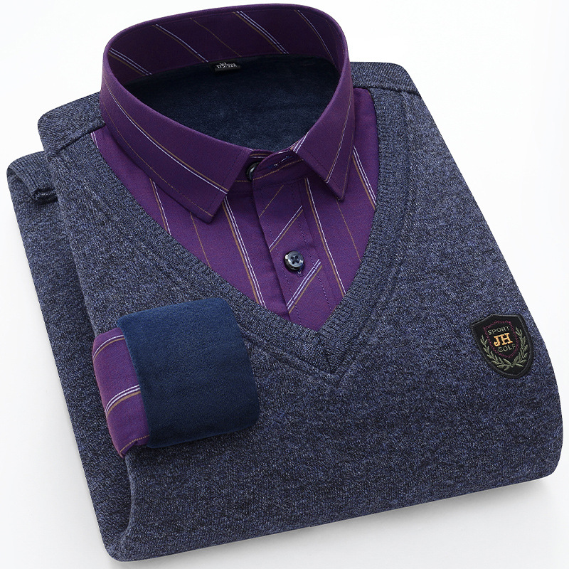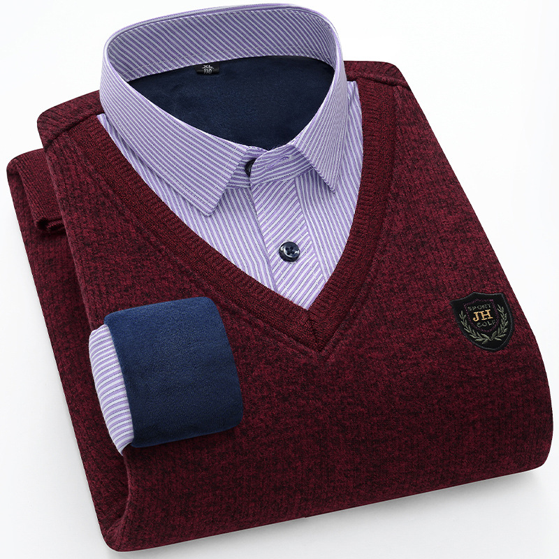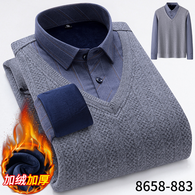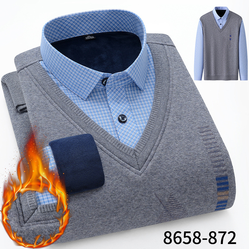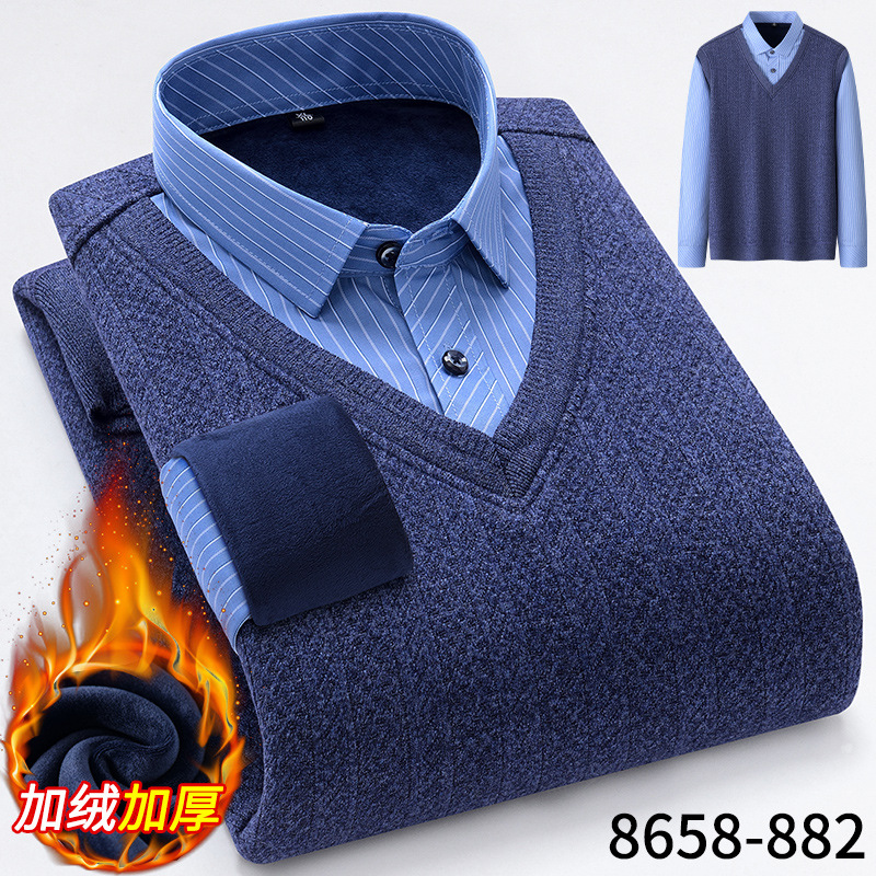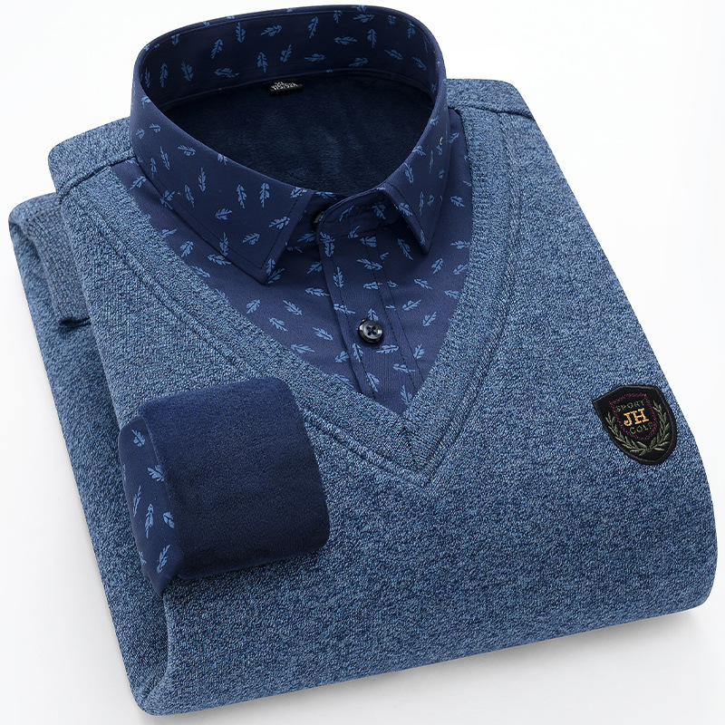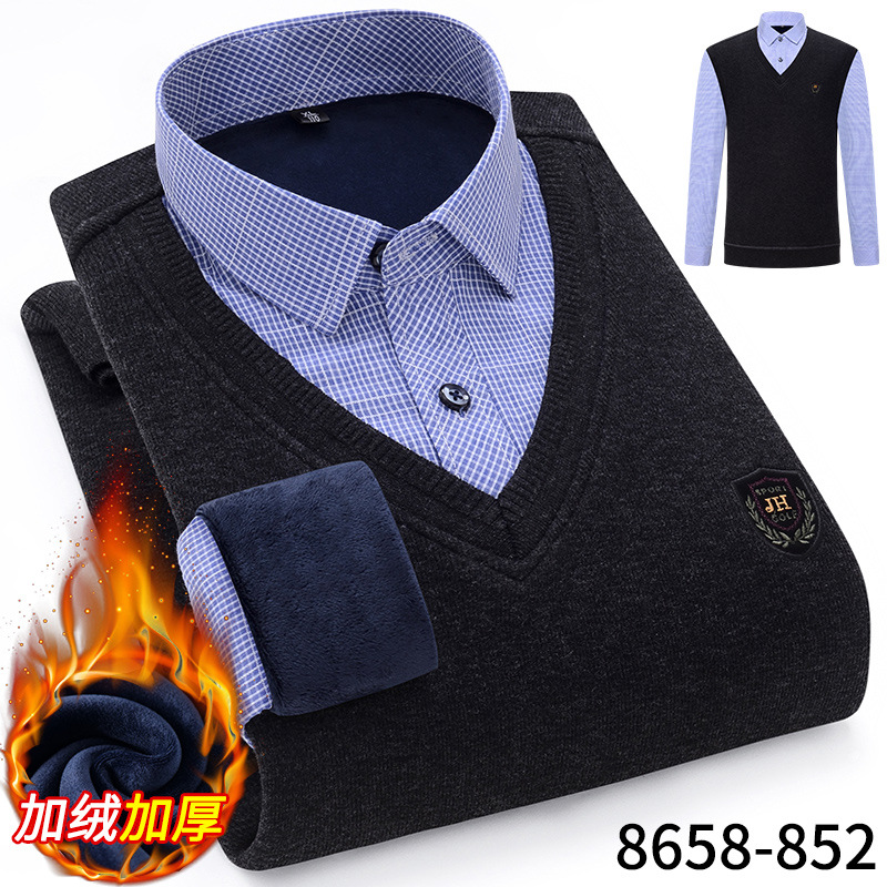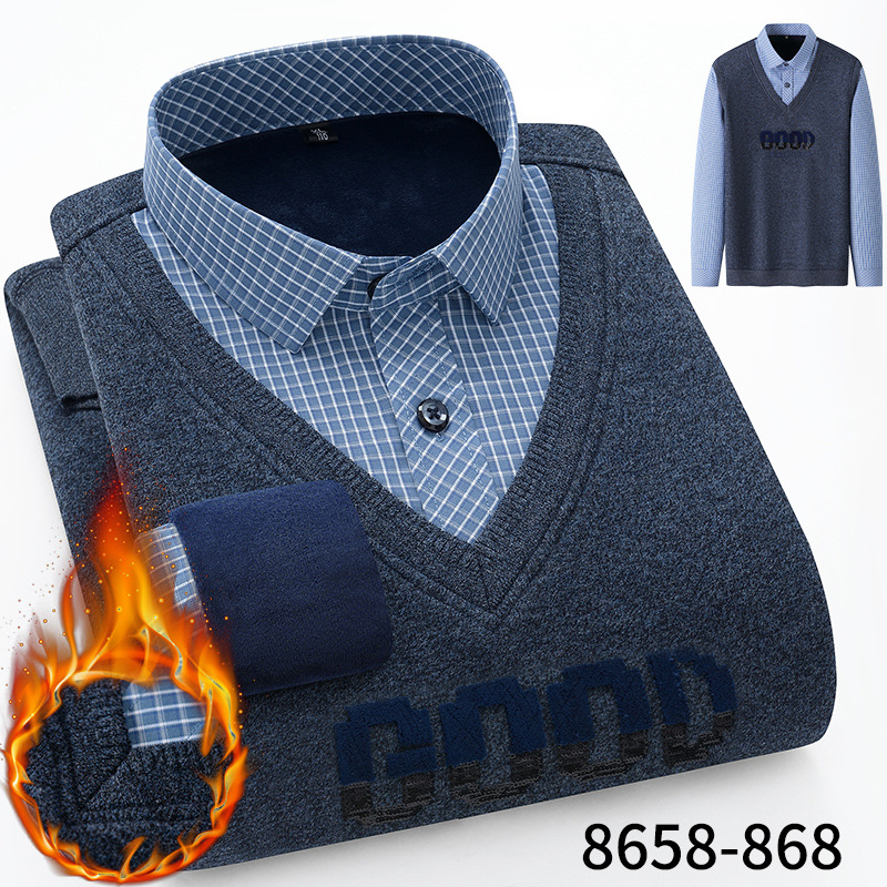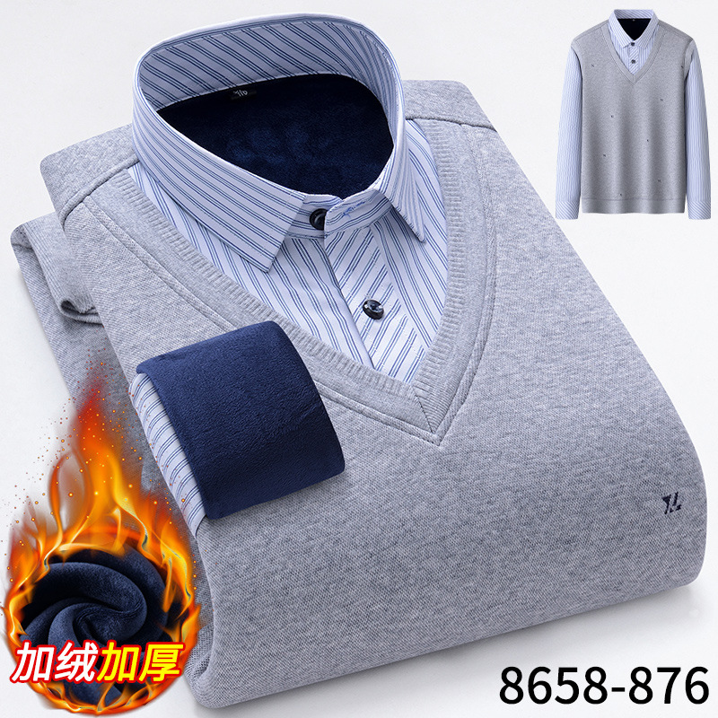 Модная мужская осенне-зимняя Молодежная мужская вязаная искусственная рубашка из двух частей с куриным воротником в виде сердца на флисовой подкладке, утолщенная теплая рубашка, топ для папы