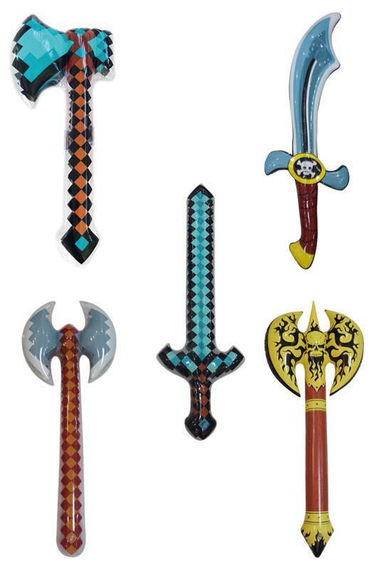 Желтый клетчатый меч 100 см.; Синий клетчатый меч 100 см.; Головка топора 98 см, серебро; Синий топор 98 см.; Желтый топор 75 см.; Синий топор 75 см.; Синяя рукопись 75 см.; Прозрачный пиратский нож 75 см.; Нож для кофе 60 см.; 70 пиратский нож; 98cm три вилки; надувной меч; катана серебро; катана золото; Серый меч 70 см.; Пиратский нож 40 см.; Желтый выбор 75 см.