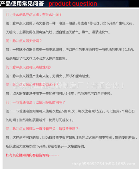 本公司专业销售脉冲电子点火枪,厨房脉冲点火器等。产品热销欧美等国外市场,得到一致好评。点火枪既可自己使用又可赠送他人。适用于各厨房、酒店、餐厅,茶馆等场所。