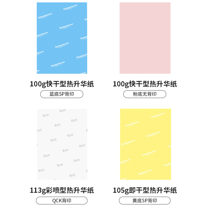 Термотрансферная бумага 4 105 г (на желтом фоне с обратной печатью SP) не скручивается; Термотрансферная бумага 4 100 г (основа без задней части); Термотрансферная бумага 4 100 г (синий фон SP обратная печать); Термотрансферная бумага 3 100 г (основа без обратной печати); Термотрансферная бумага 3 100 г (синий фон SP обратной печати); Термотрансферная бумага 3 105 г (на желтом фоне с обратной печатью SP) не скручена