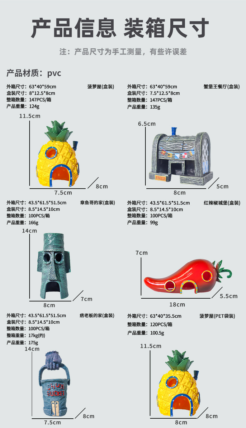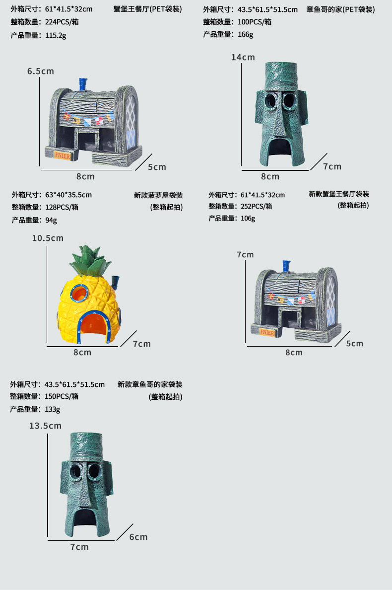 Миниатюрный домик Сквидварда с отверстиями (ПВХ); 2026 Оранжевая сумка «Ананасовый домик» 150 шт./кор.; Мини-пустой домик из ананаса (борьба с аквариумом, скорлупа краба-отшельника); 2025 пакетов «Ананасовый домик» (150 шт./кор.) Цена отпускная за всю коробку; Новая сумка-домик с ананасом (128 шт./кор.) Цена отпускной за всю коробку.; Новое поступление домашней сумки Сквидварда (150 шт./кор.), стартовая цена — вся коробка.; Новые сумки для ресторана Crab King (252 шт./кор.) Цена от полной коробки; Набор из трех предметов «Губка Боб Квадратные штаны»; Набор из 6 предметов «Губка Боб Квадратные Штаны» (новый стиль); Набор из 6 предметов «Губка Боб Квадратные Штаны» (старый стиль); Набор из 8 предметов «Губка Боб Квадратные Штаны»; Домик с ананасами (в коробке) 147 шт. в коробке; Ресторан «Краб Кинг» (в коробке) 147 за коробку; Дом Сквидварда (в коробке) 100 штук в коробке; Замок красного перца (в коробке); Ананасовый домик (ПЭТ-пакет) (120 шт/кор.) Стартовая цена за всю коробку; Ресторан Crab King (ПЭТ-пакет) Пакет Crab King Restaurant (224 шт./кор.) Цена от полной коробки; Домик Сквидварда (ПЭТ-пакет) (108 шт./кор.) Стартовая цена за всю коробку; Дом Босса Пай (в коробке); Мини-домик из ананаса; Ресторан «Мини Краб Кинг»; Домик Мини Кальмара