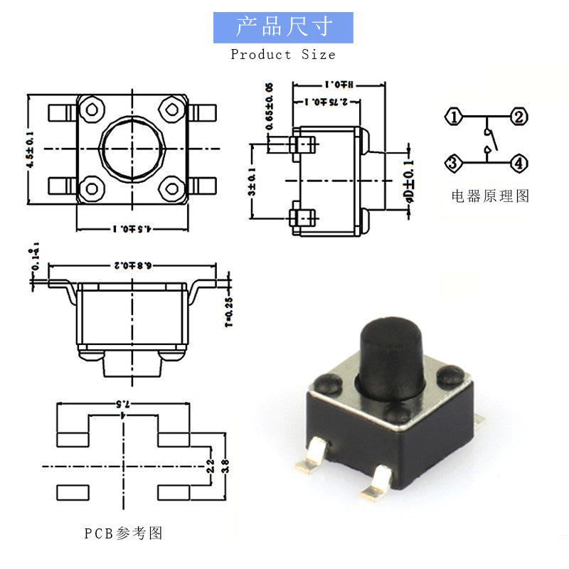 Сенсорный переключатель 4.5*4.5*3.8/4.3H кнопочный переключатель патч с медной ножкой высокая температура окружающей среды микро-кнопки