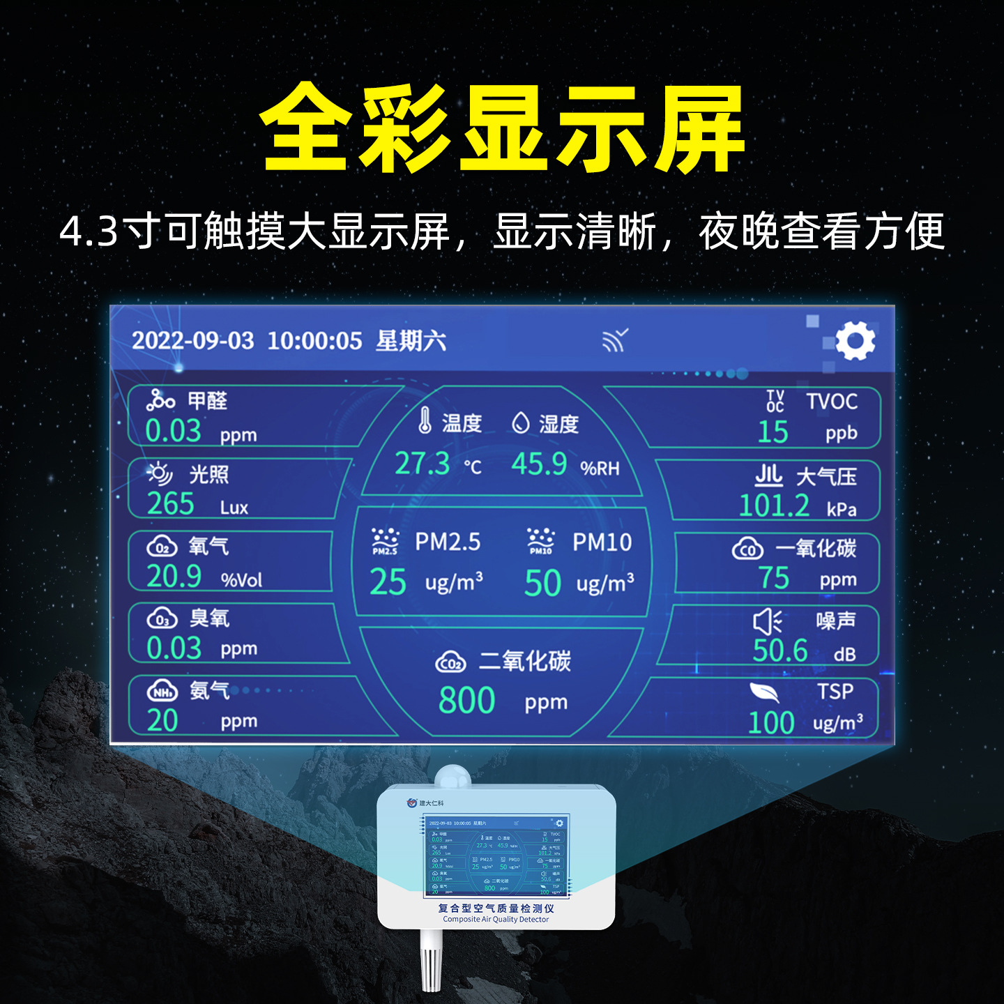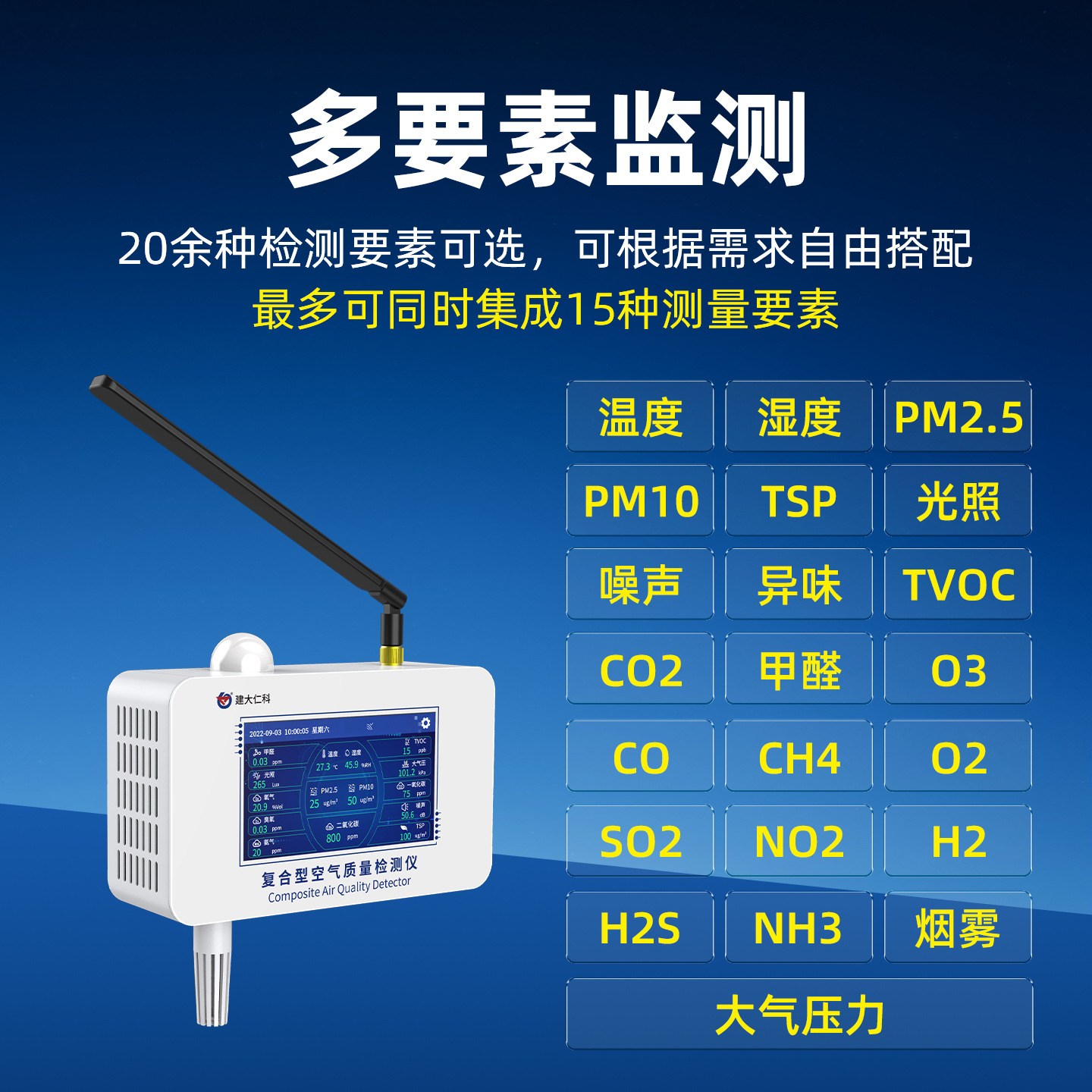 Температура, влажность, PM2,5, PM10, TSP, давление воздуха, свет, шум, запах, летучие органические соединения, CO2, формальдегид, O3 и т. д.