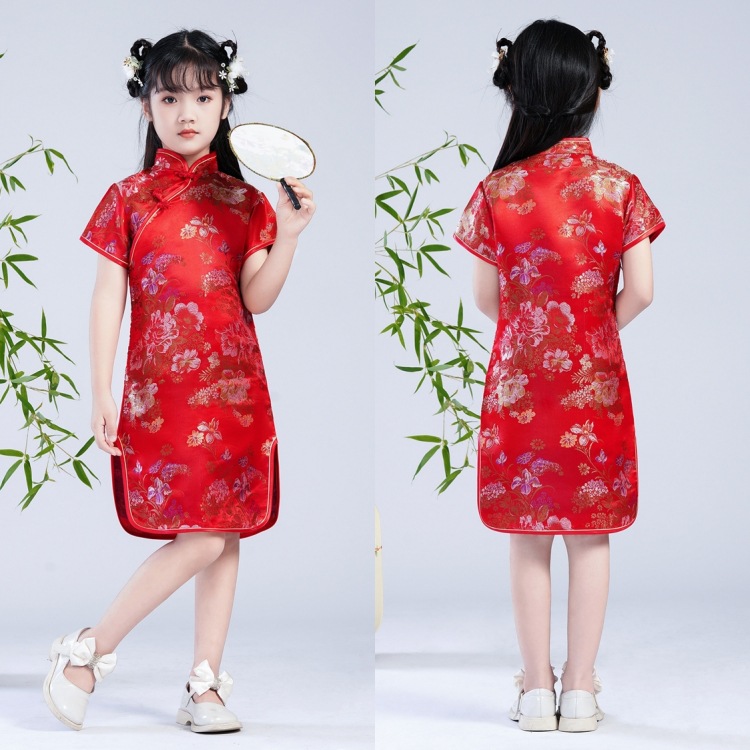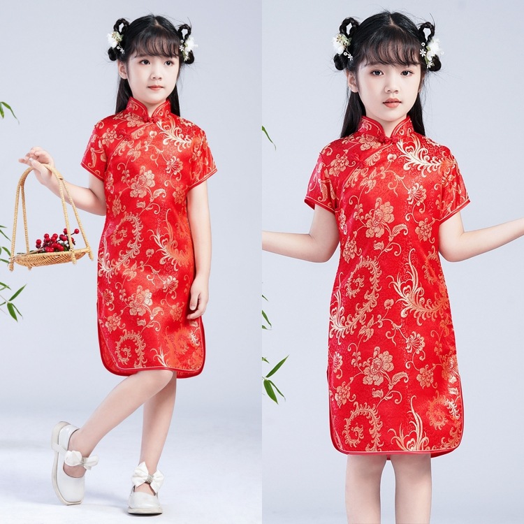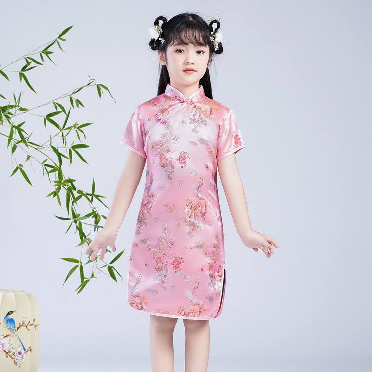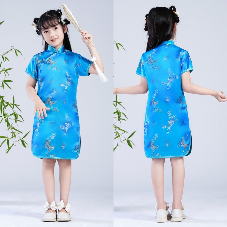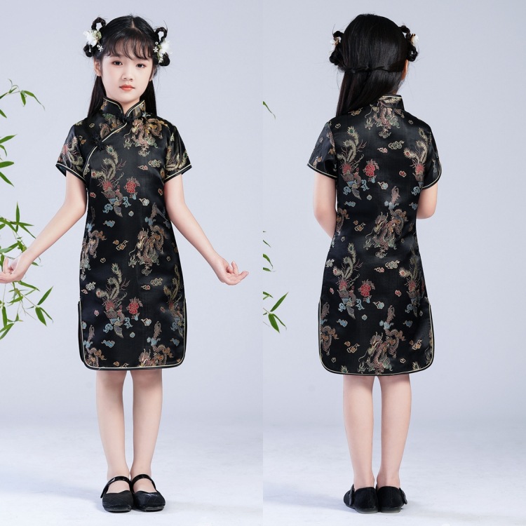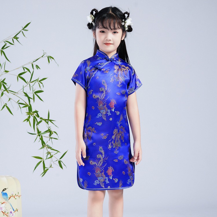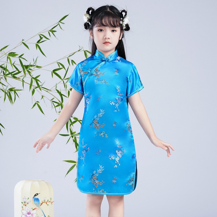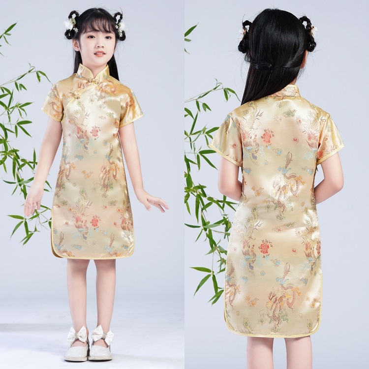 Винтажное платье Cheongsam в китайском стиле для девочек из парчи с воротником-стойкой и пряжкой, летнее платье для девочек, сценический костюм
