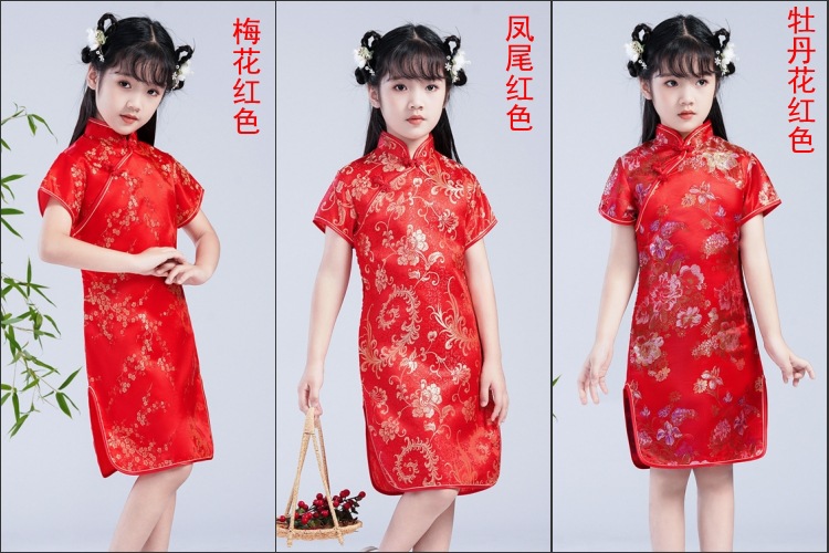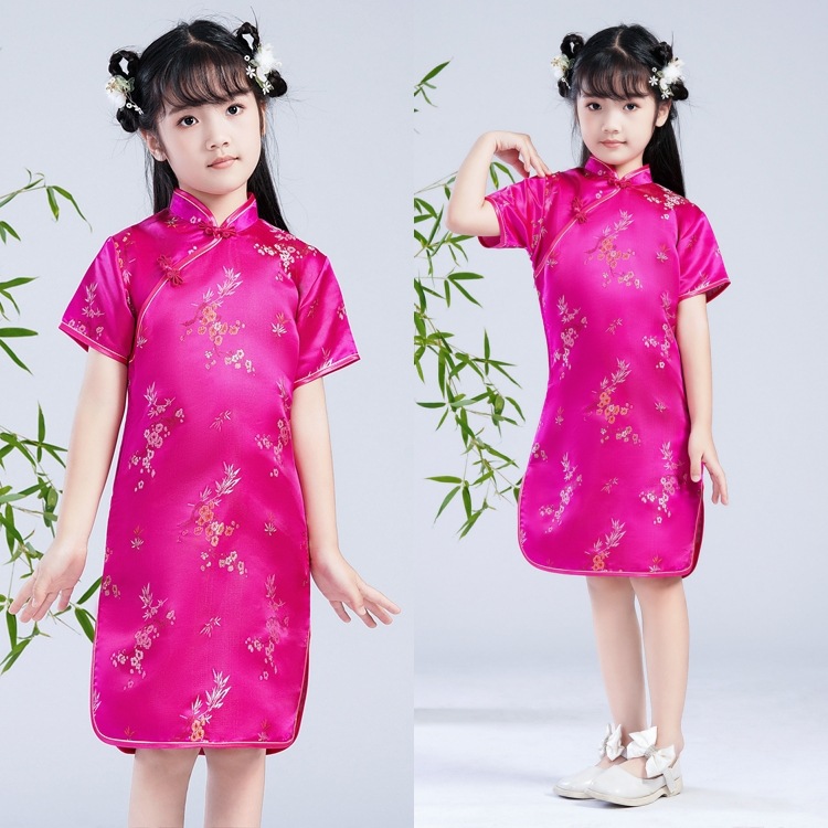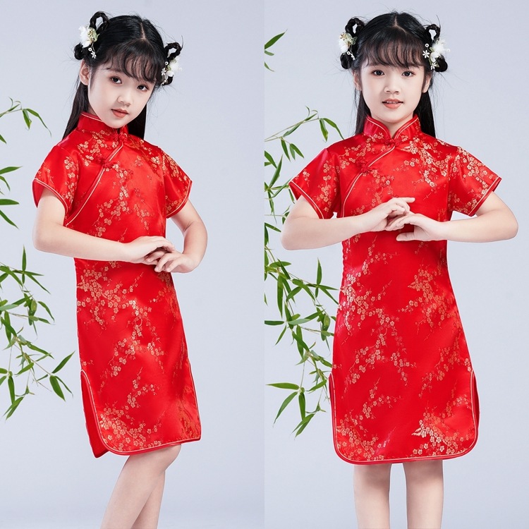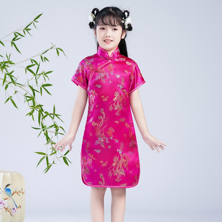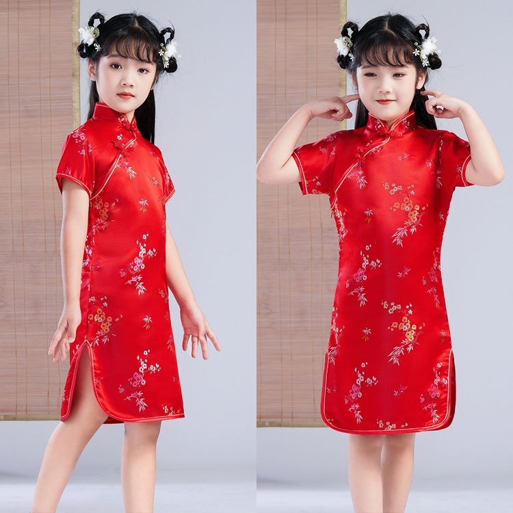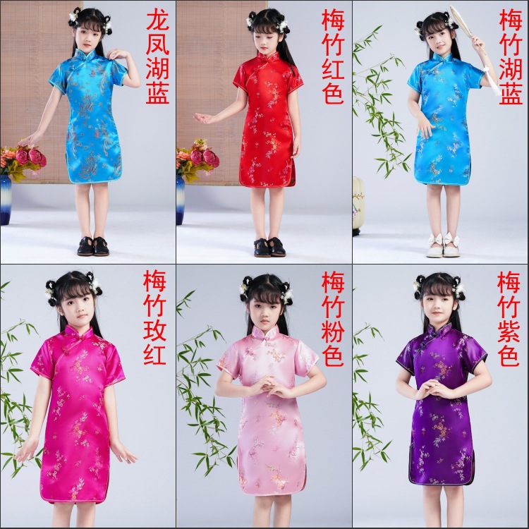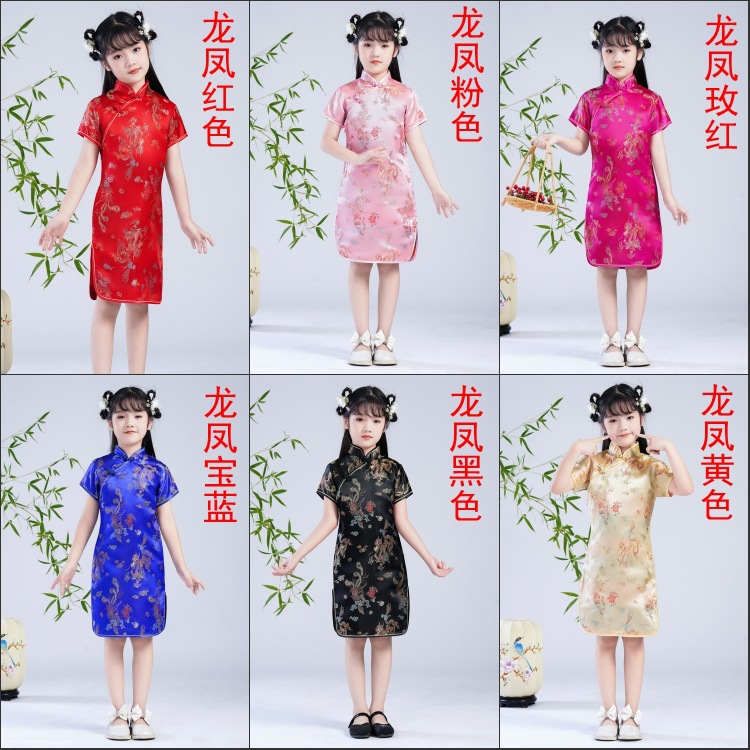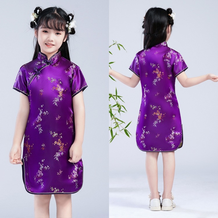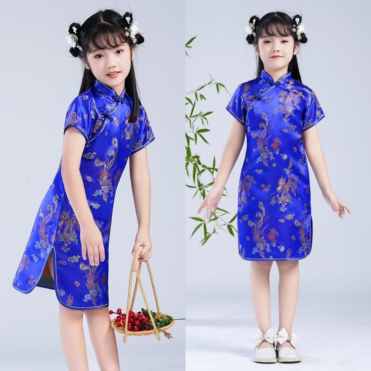 Винтажное платье Cheongsam в китайском стиле для девочек из парчи с воротником-стойкой и пряжкой, летнее платье для девочек, сценический костюм