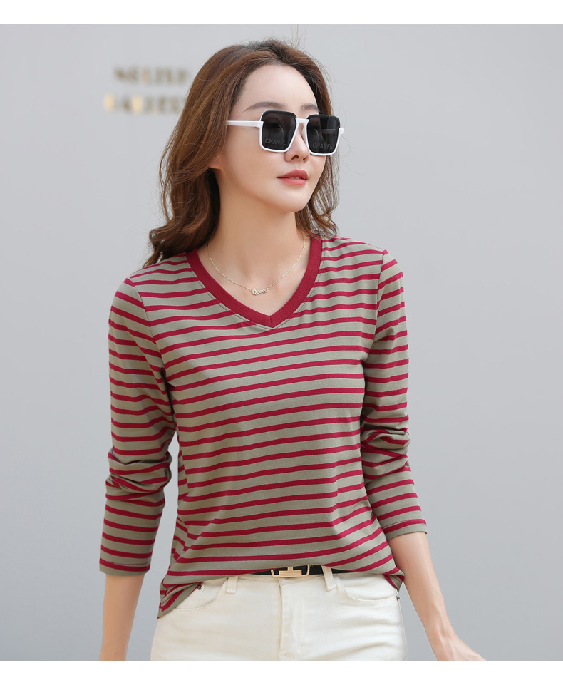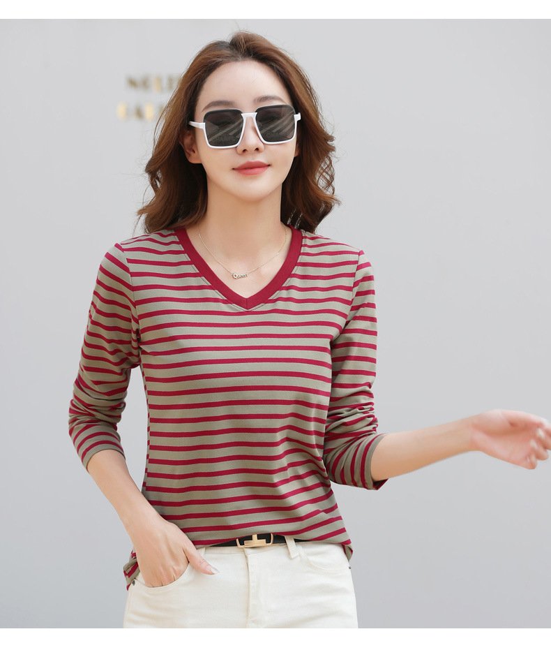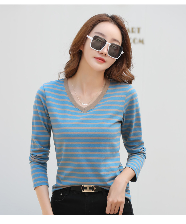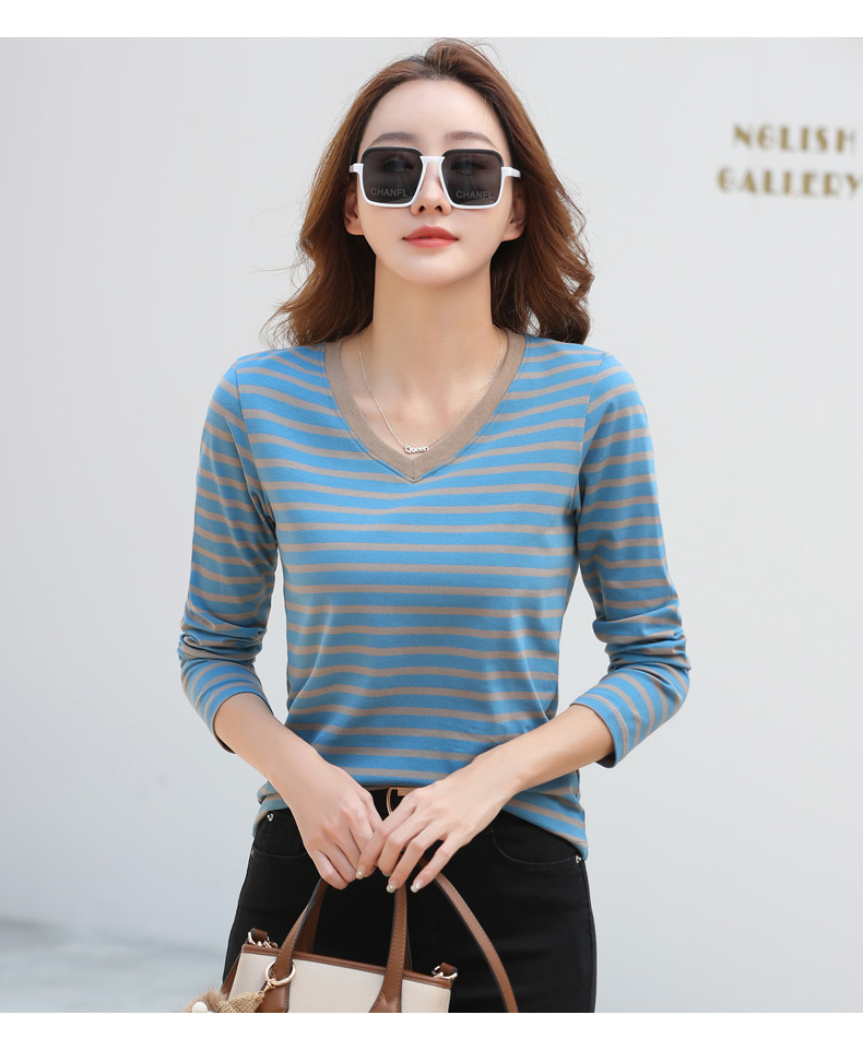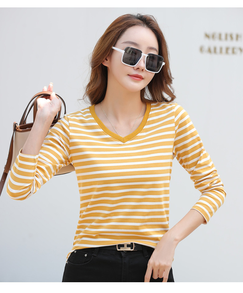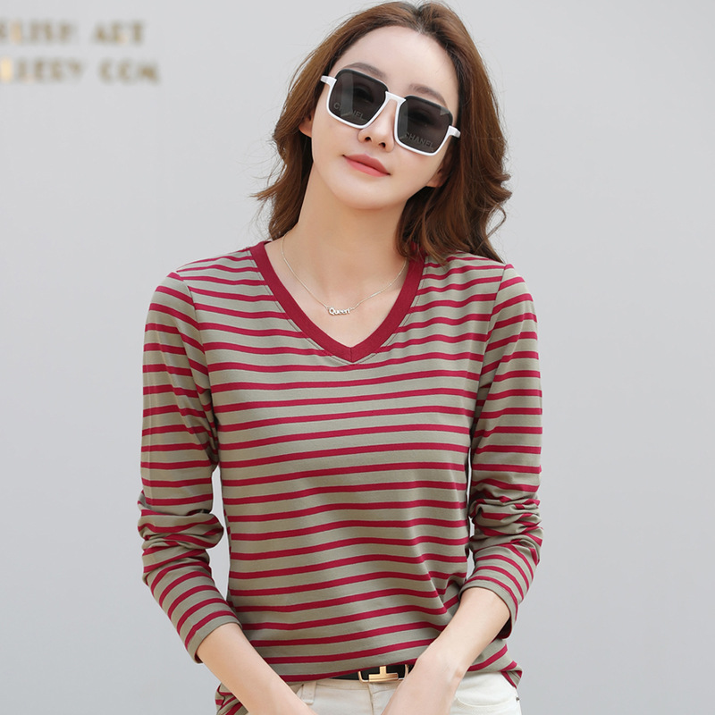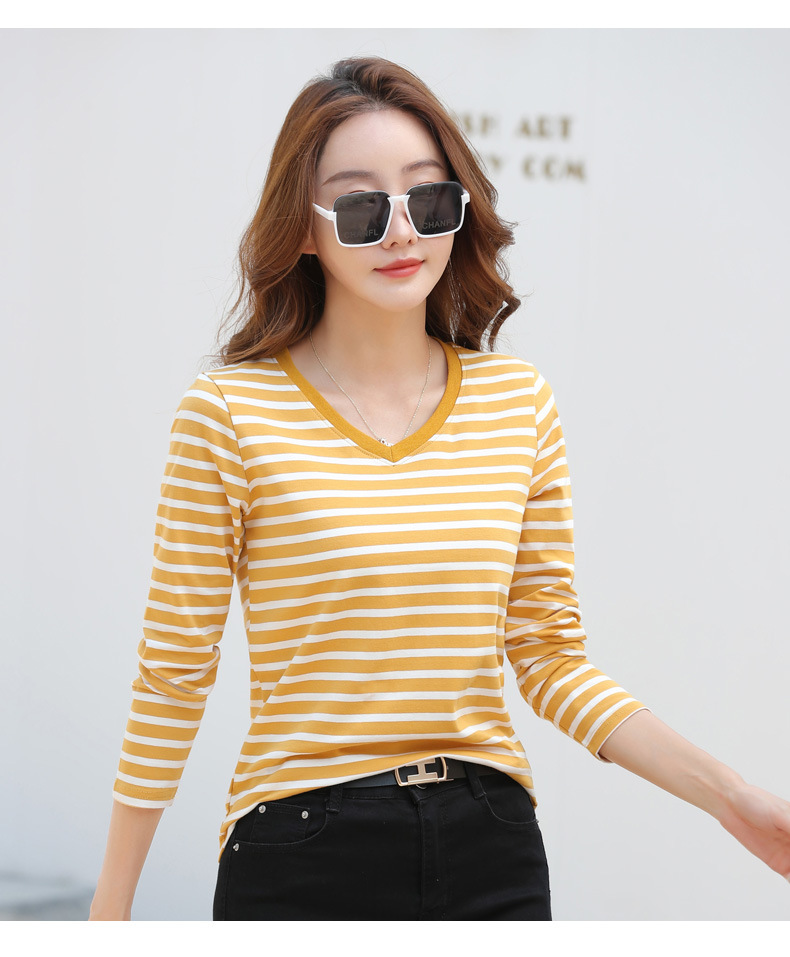379 Женская универсальная Базовая рубашка в полоску с длинными рукавами для осени и зимы, приталенная Винтажная футболка контрастного цвета в полоску с V-образным вырезом