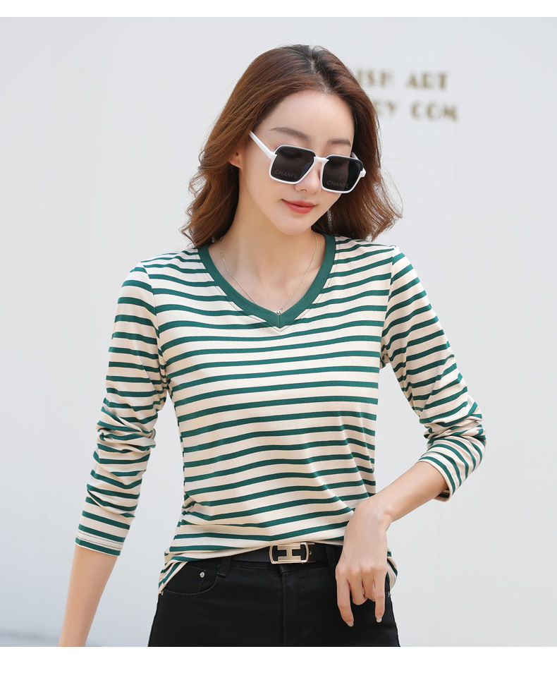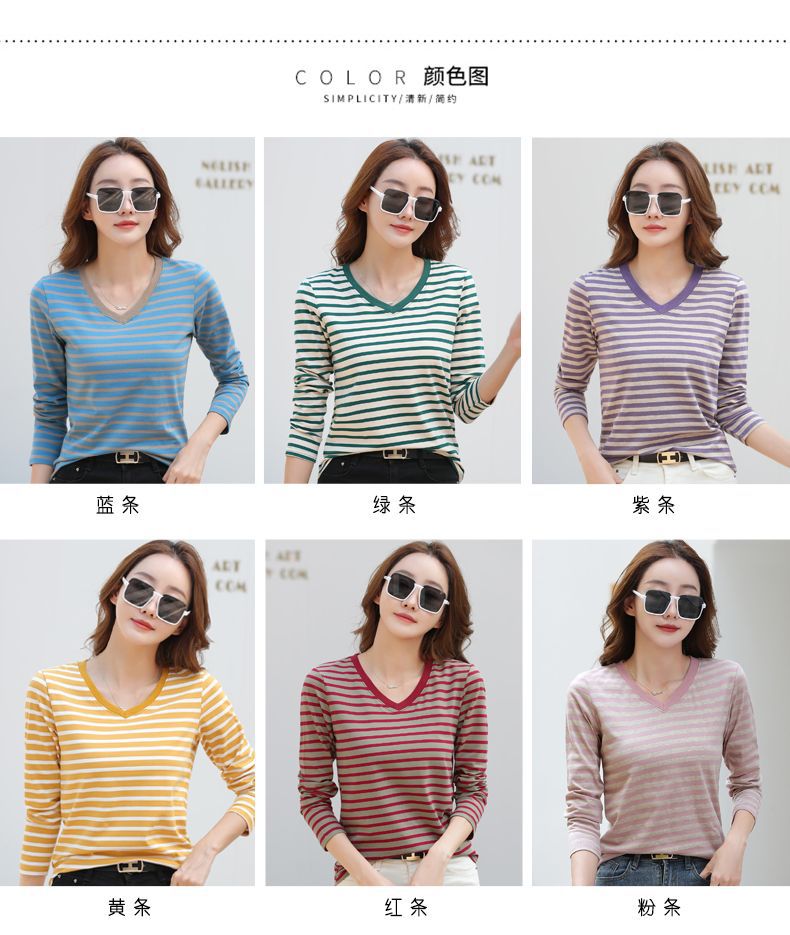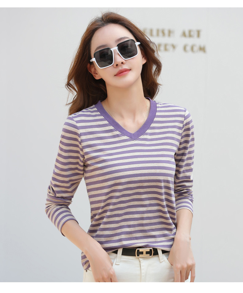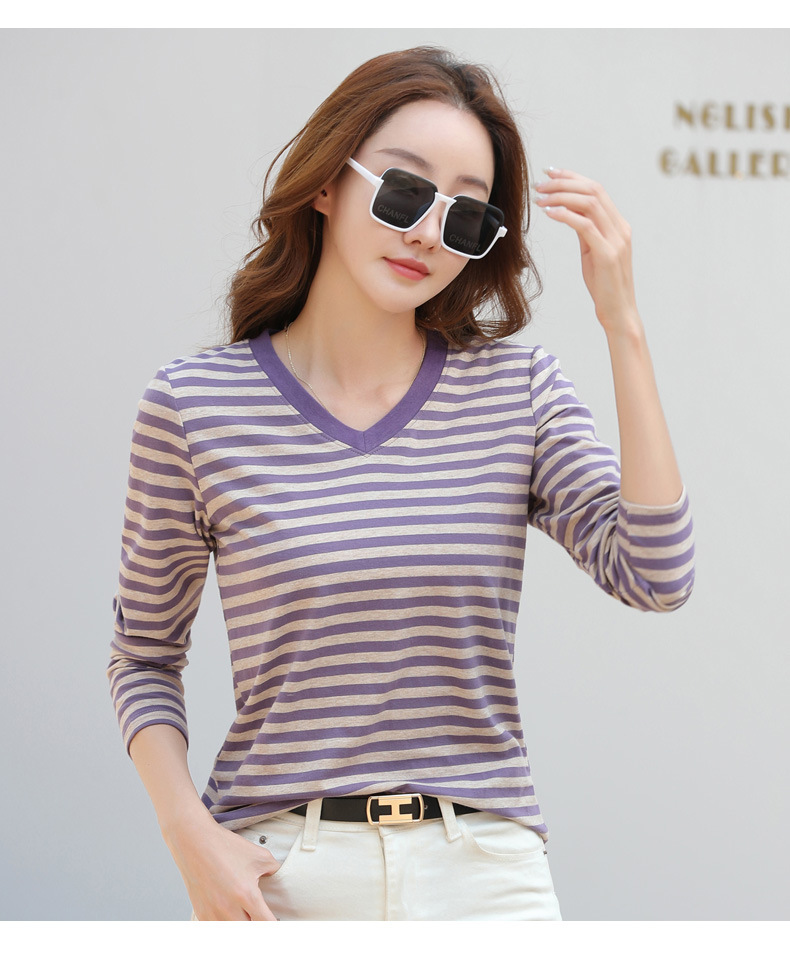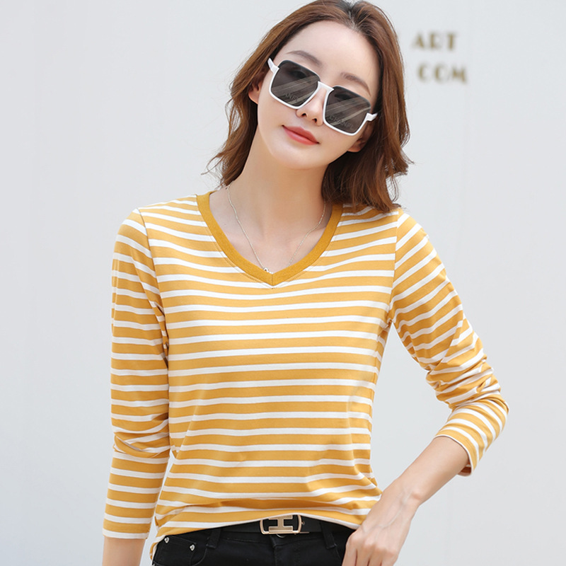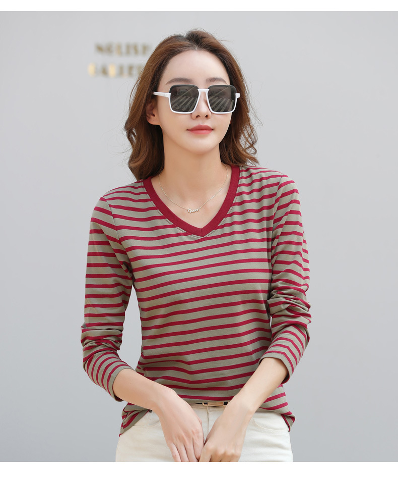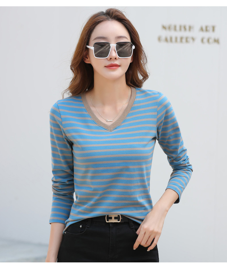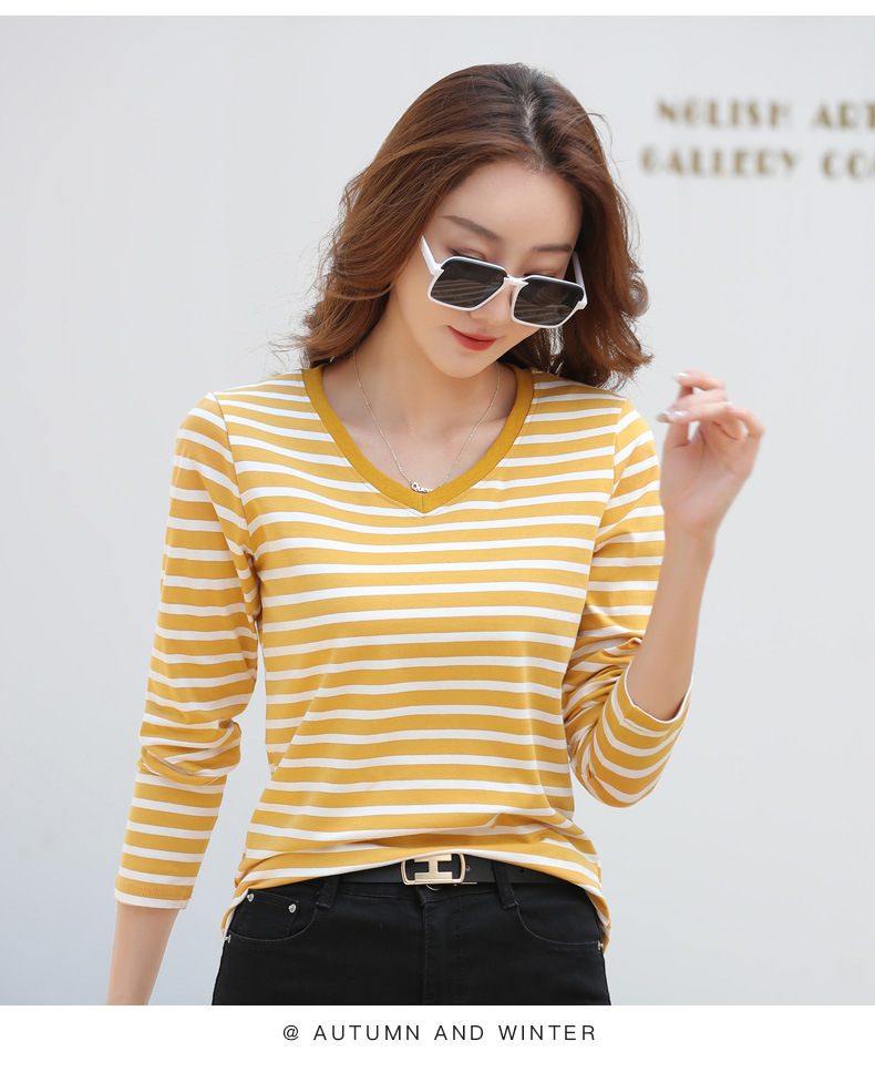 379 Женская универсальная Базовая рубашка в полоску с длинными рукавами для осени и зимы, приталенная Винтажная футболка контрастного цвета в полоску с V-образным вырезом