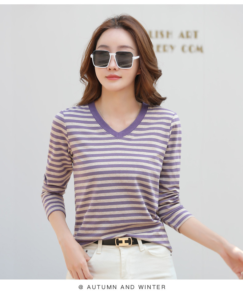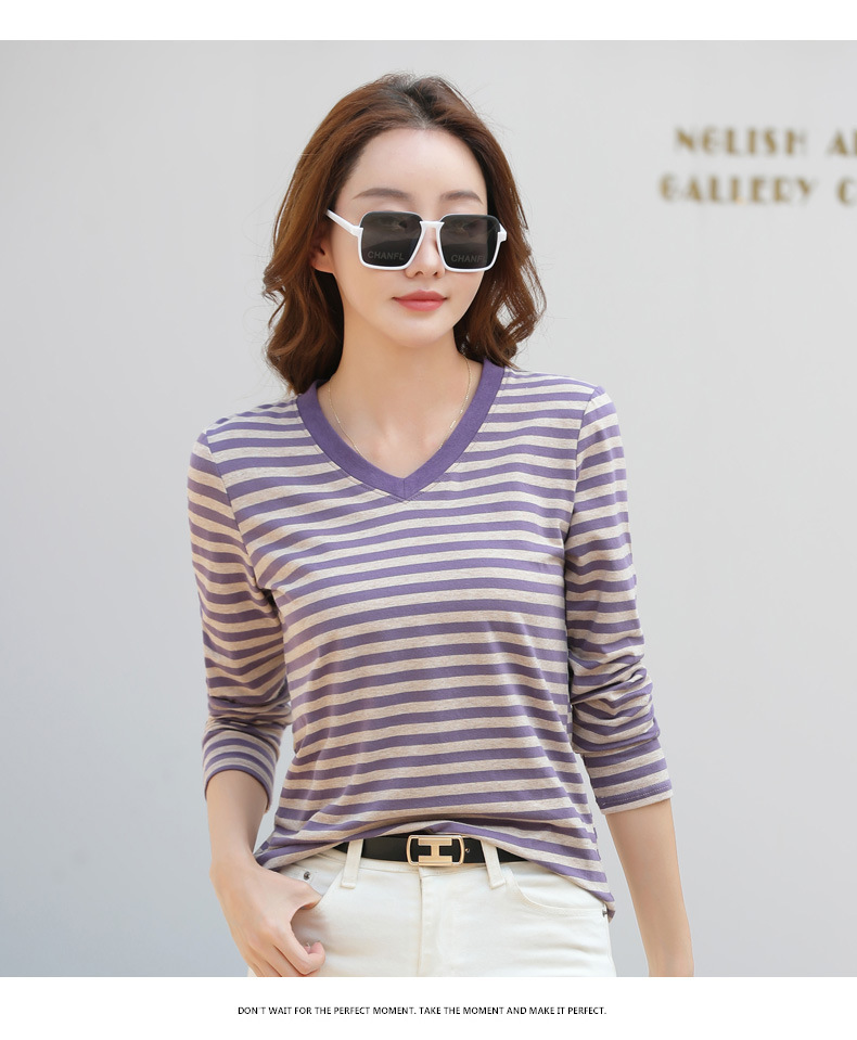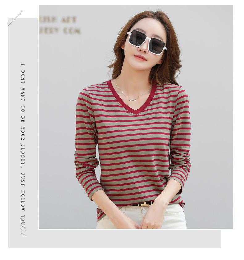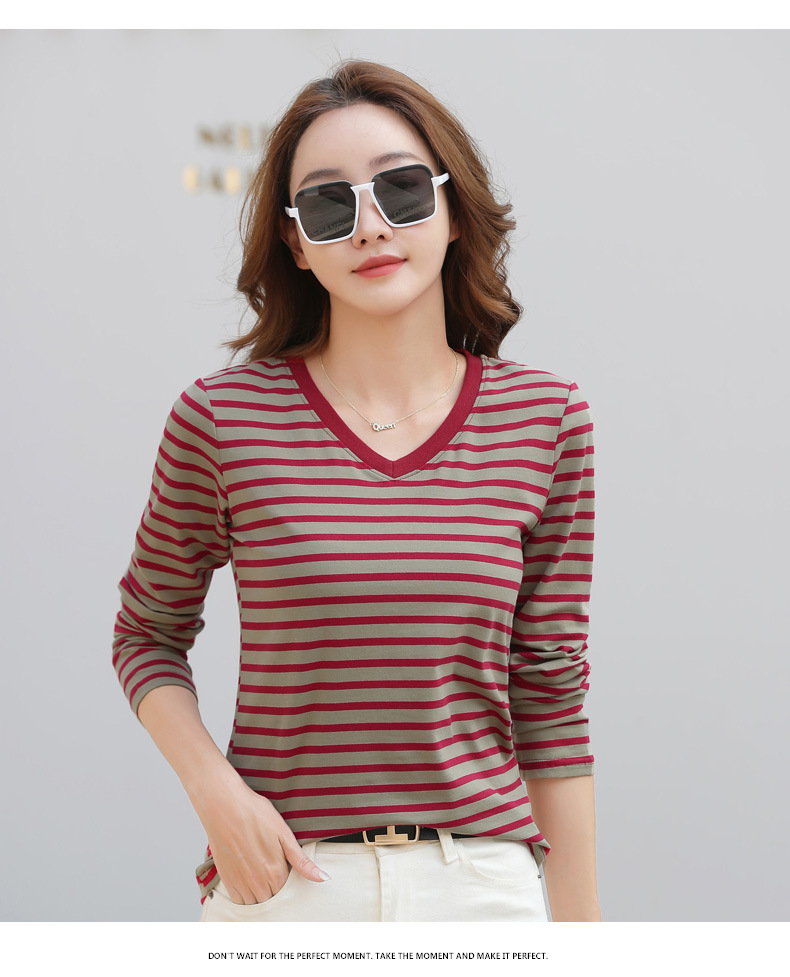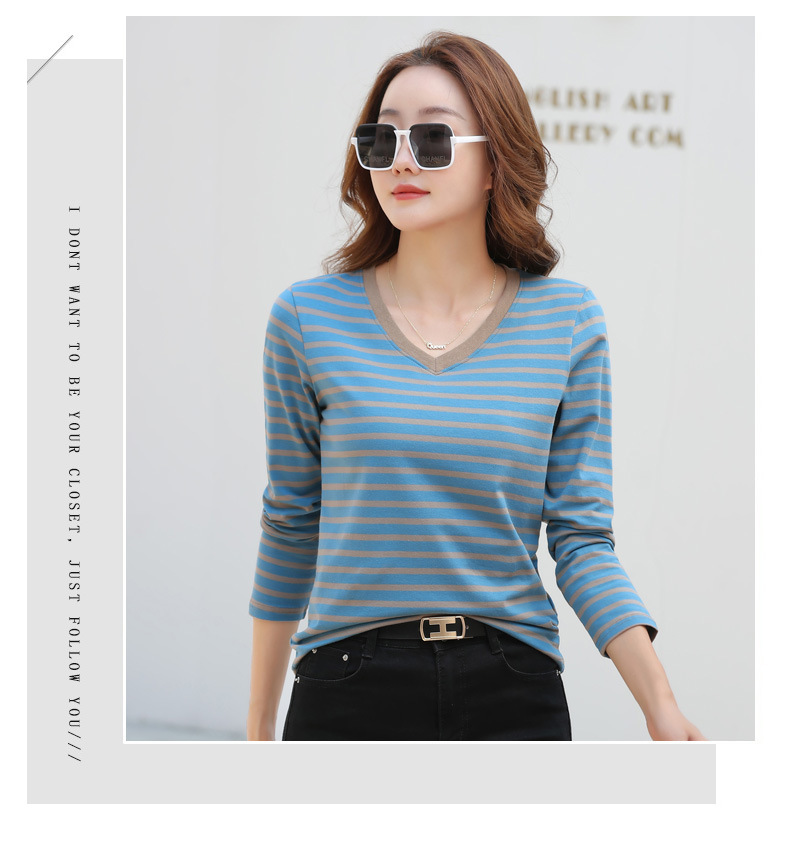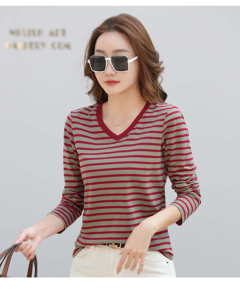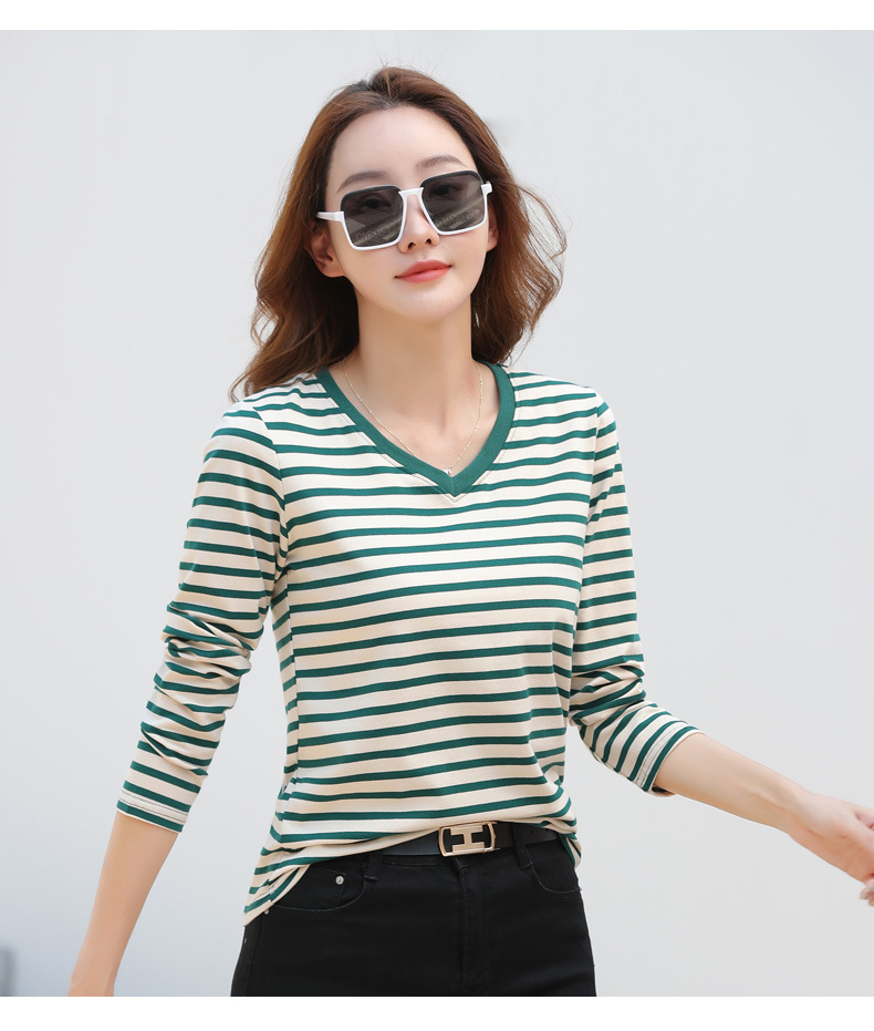 379 Женская универсальная Базовая рубашка в полоску с длинными рукавами для осени и зимы, приталенная Винтажная футболка контрастного цвета в полоску с V-образным вырезом