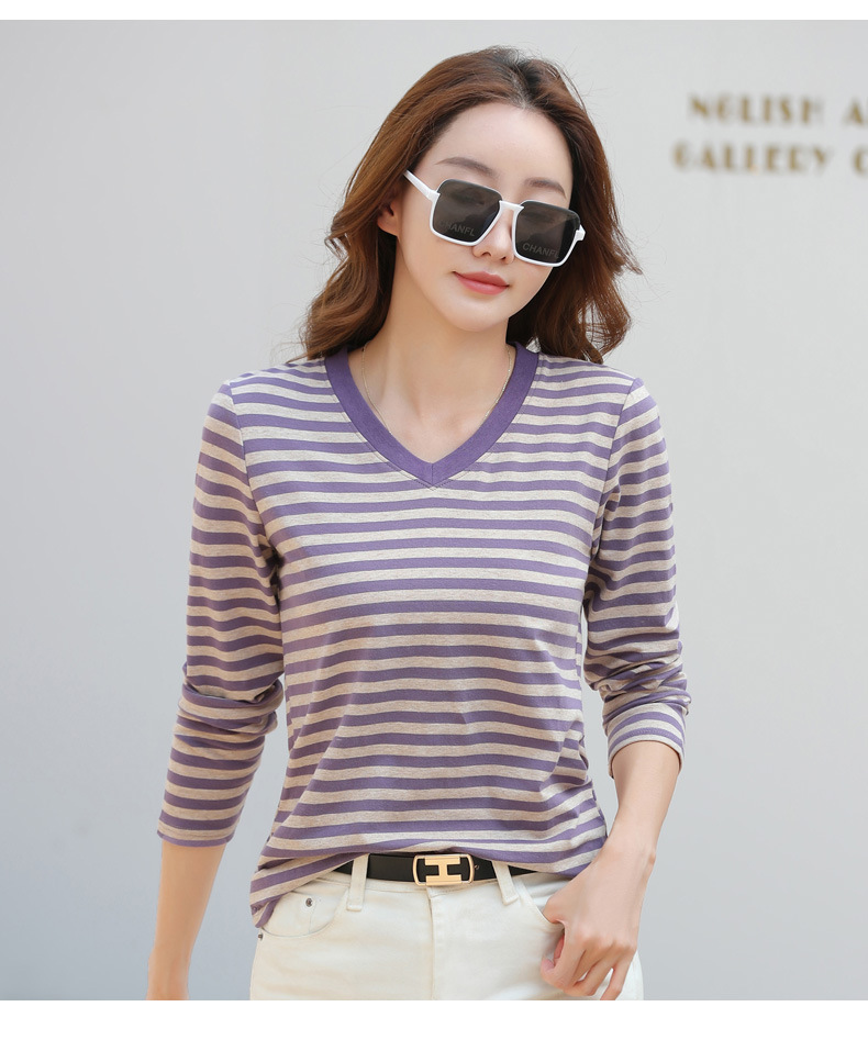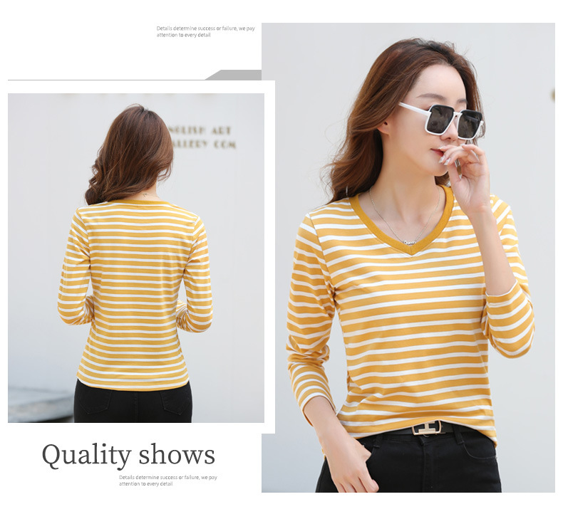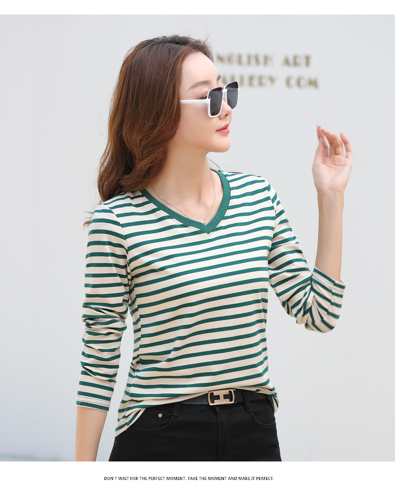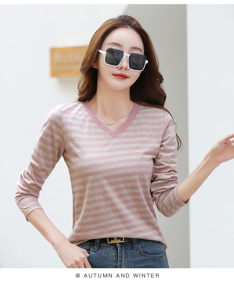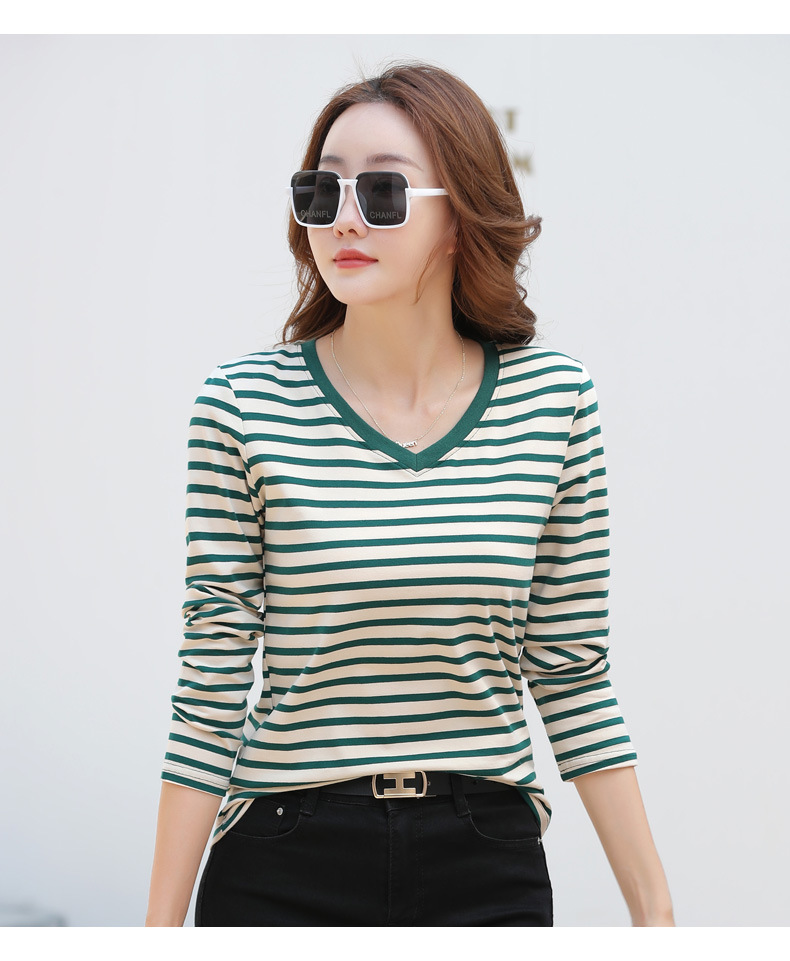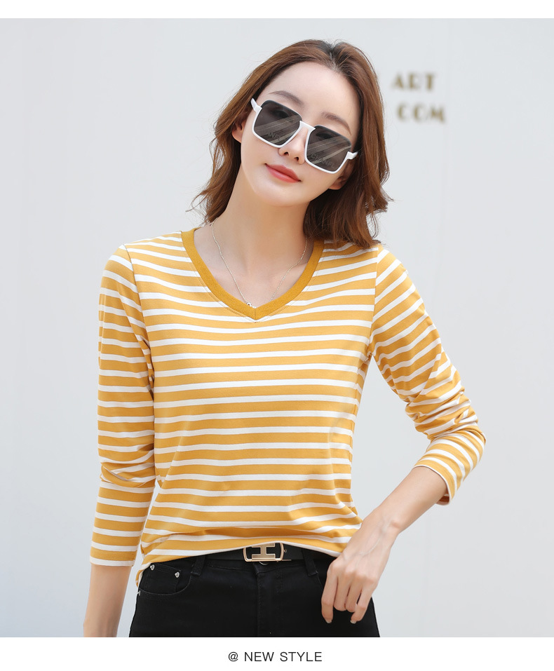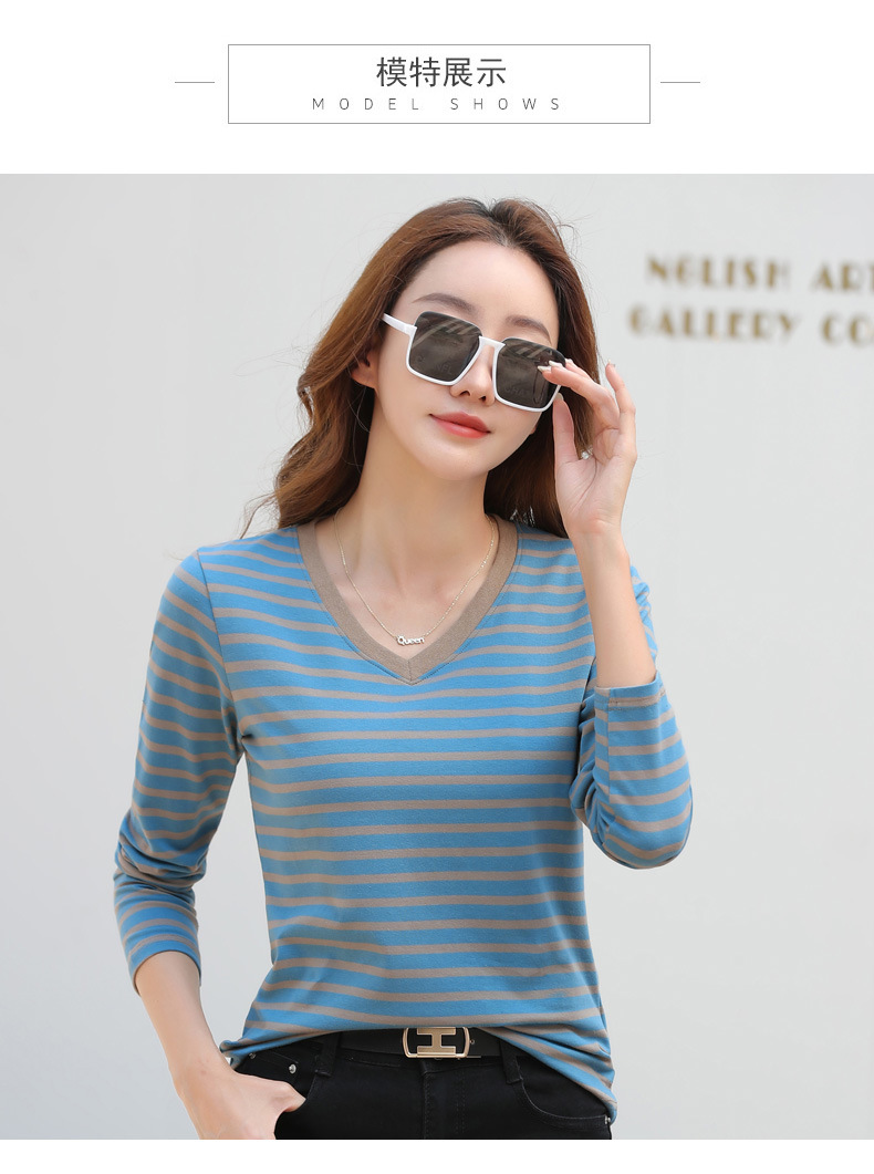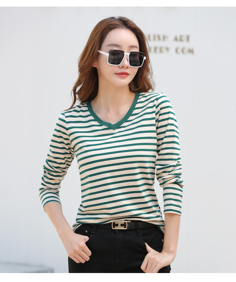 379 Женская универсальная Базовая рубашка в полоску с длинными рукавами для осени и зимы, приталенная Винтажная футболка контрастного цвета в полоску с V-образным вырезом