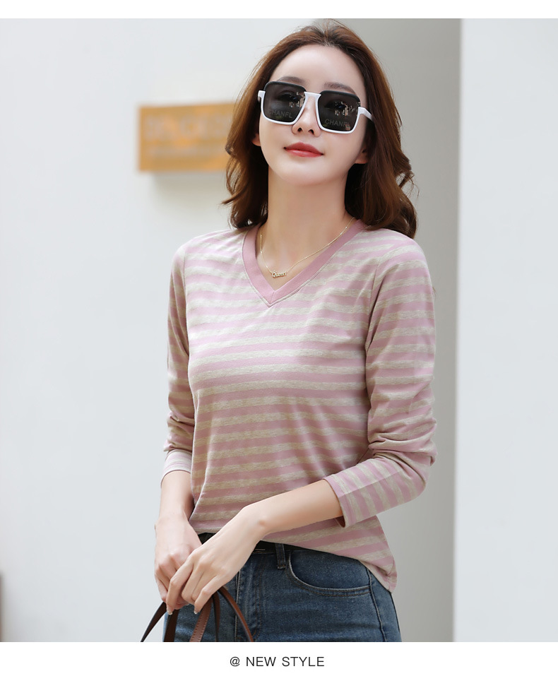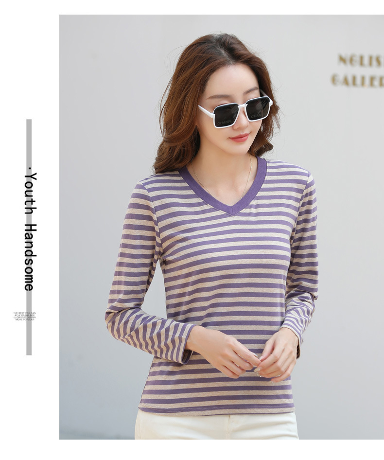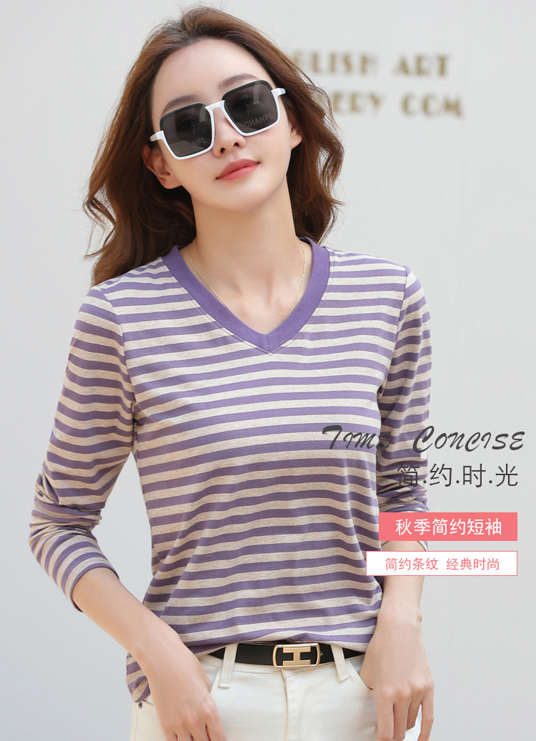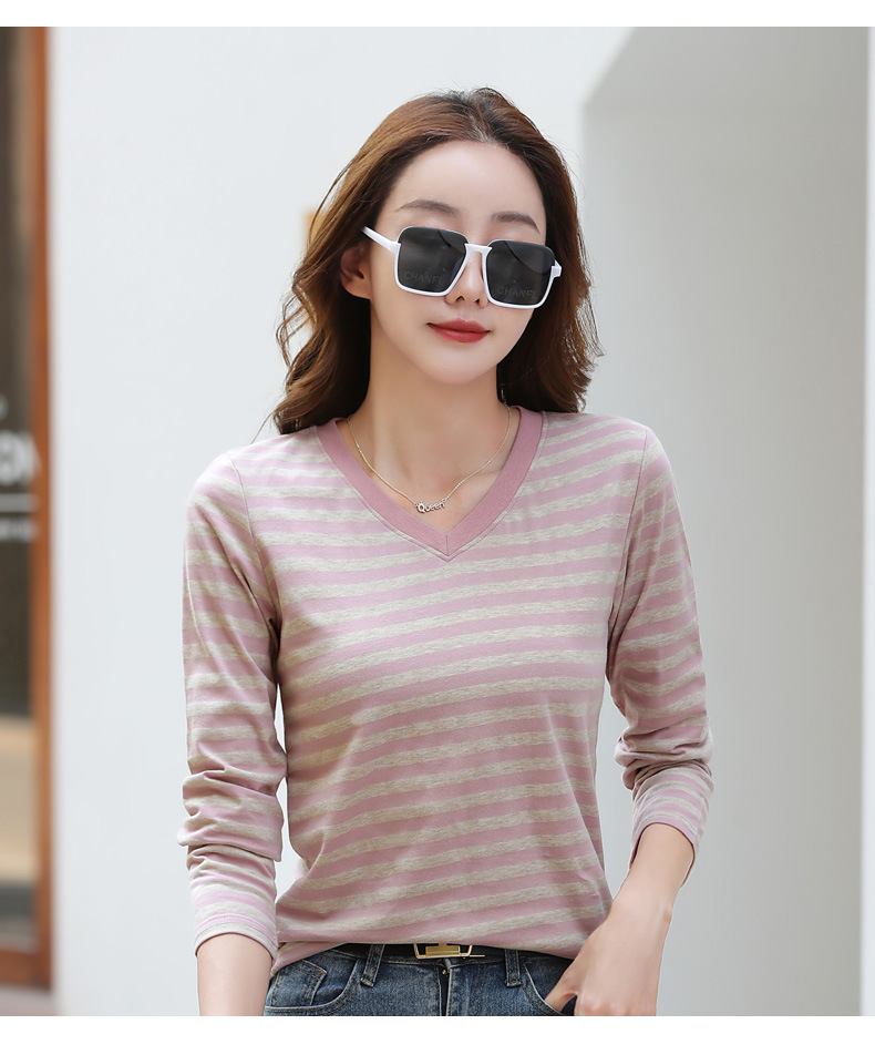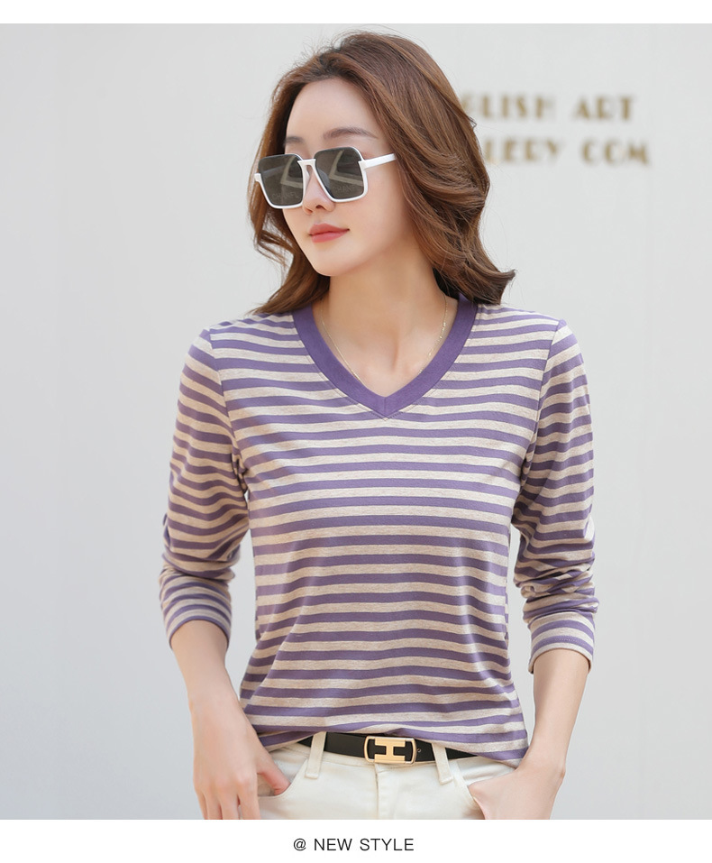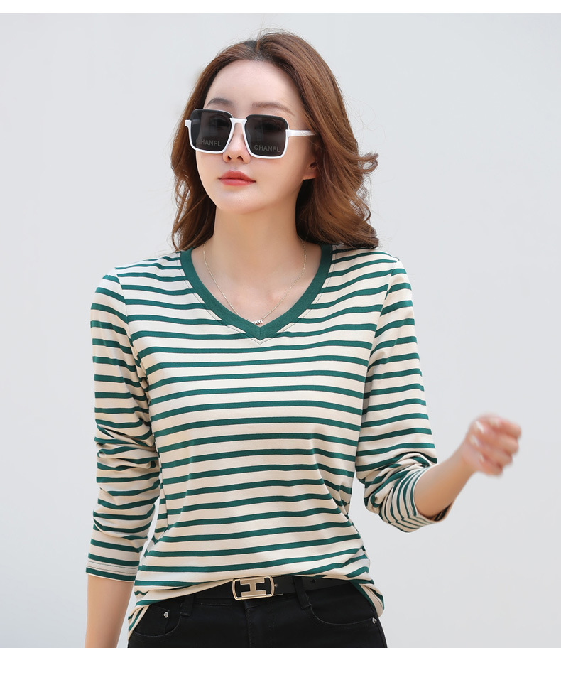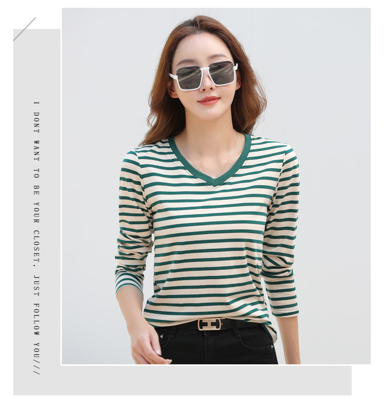 379 Женская универсальная Базовая рубашка в полоску с длинными рукавами для осени и зимы, приталенная Винтажная футболка контрастного цвета в полоску с V-образным вырезом