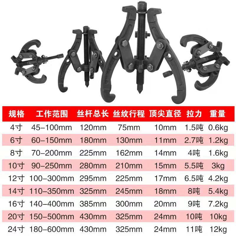 3inch съемник 75 мм [можно переключать два/три захвата]; 4inch съемник 100 мм [можно переключать два/три захвата]; 6inch съемник 150 мм [можно переключать два/три захвата]; 8inch съемник 200 мм [можно переключать два/три захвата]; 10inch съемник 250 мм [можно переключать два/три захвата]; 12inch съемник 300 мм [можно переключать два/три захвата]; 14inch съемник 350 мм [можно переключать два/три захвата]; 16inch съемник 400 мм [можно переключать два/три захвата]; 20inch съемник 500 мм [можно переключать два/три захвата]; 24inch съемник 600 мм [три когтя]; 28inch съемник 700 мм [три когтя]