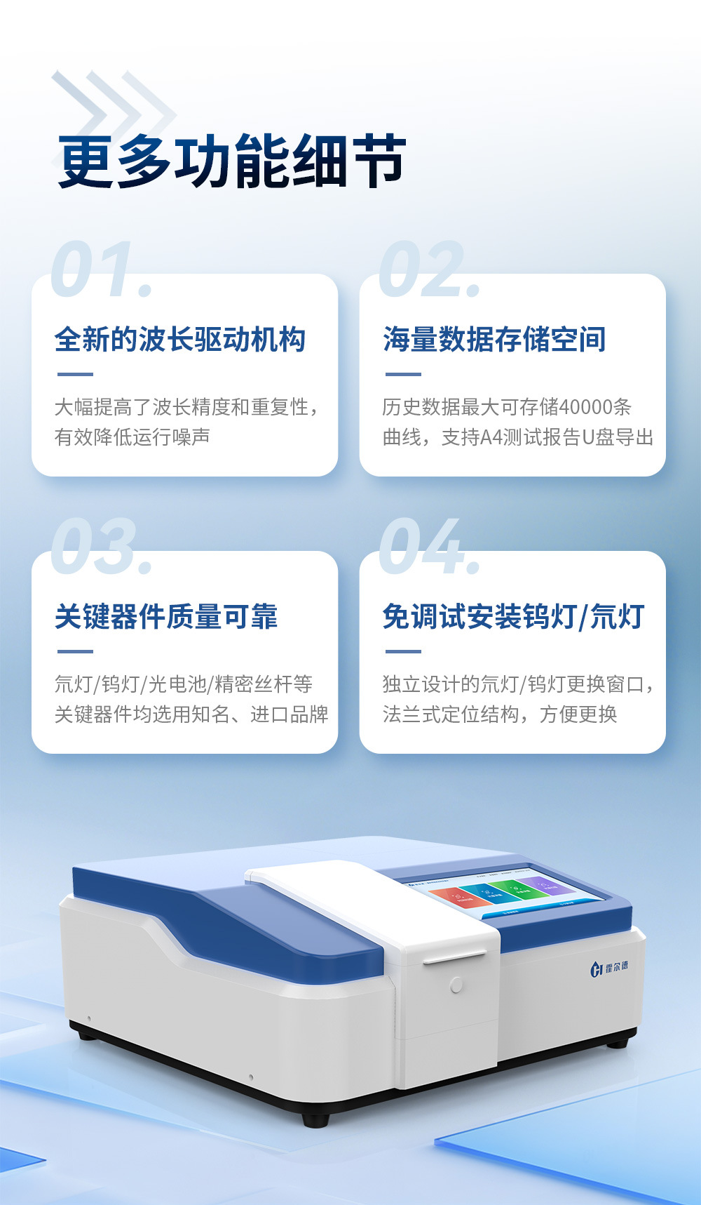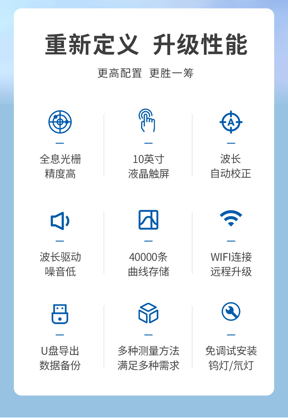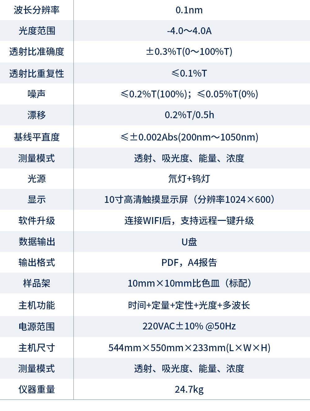 Видимая/Ручная длина волны ±2 нм; Видимая/Автоматическая длина волны ±1 нм; УФ одиночный луч ±1 нм; УФ одиночный луч ±0,8 нм; Высокая точность/УФ-одиночный луч ±0,3 нм/сенсорный экран 10inch; УФ-квази-двойной луч ±0,5 нм; УФ-квази-двойной луч ±0,5 нм/ПК; УФ-квази-двойной луч ±0,3 нм; УФ-квази-двойной луч ±0,3 нм/ПК; УФ-квази-двойной луч ±0,3 нм/регулируемая ширина полосы; УФ-квази-двойной луч ±0,3 нм / Регулируемая полоса пропускания / ПК; УФ-квази-двойной луч ±0,3 нм / 10inch сенсорный экран; УФ-двойной луч ±0,3 нм / 7inch экран; УФ-двойной луч ±0,3 нм/ПК/ сенсорный экран 10inch; УФ-двойной луч ±0,3 нм/регулируемая полоса пропускания/ПК/сенсорный экран 10inch; Дополнительное программное обеспечение обратного управления ПК