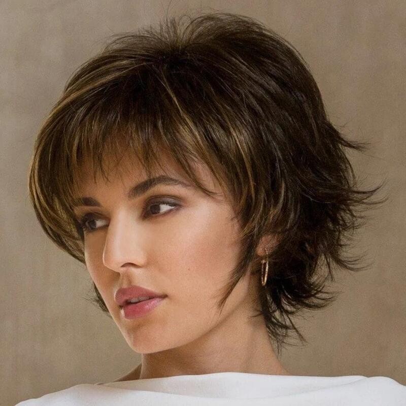 Экспортные парики для женщин: короткие прямые волосы, пушистая короткая челка, темно-коричневый цвет с золотистыми мелированиями, с внешними короткими кудрявыми волосами.