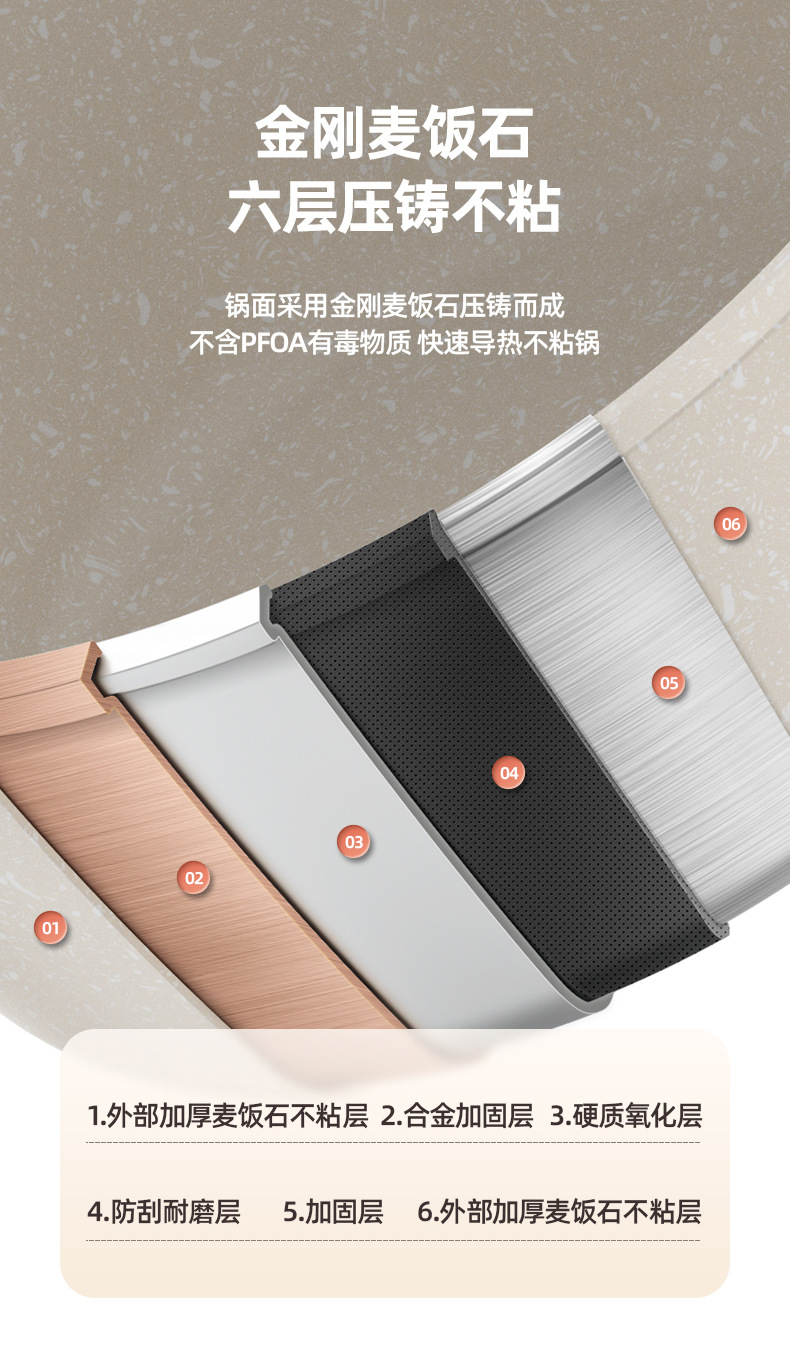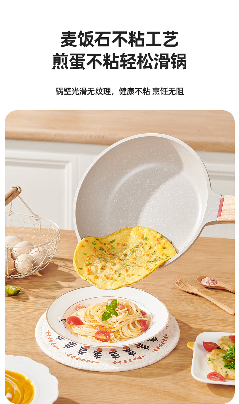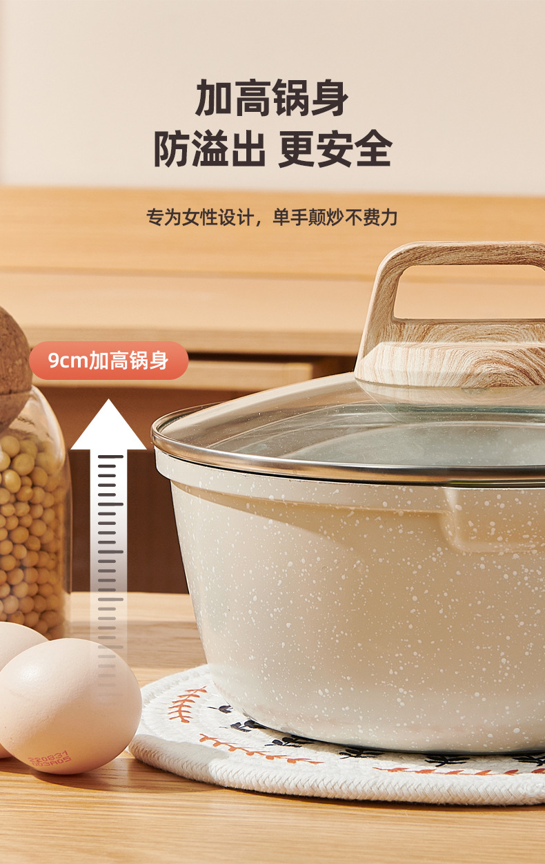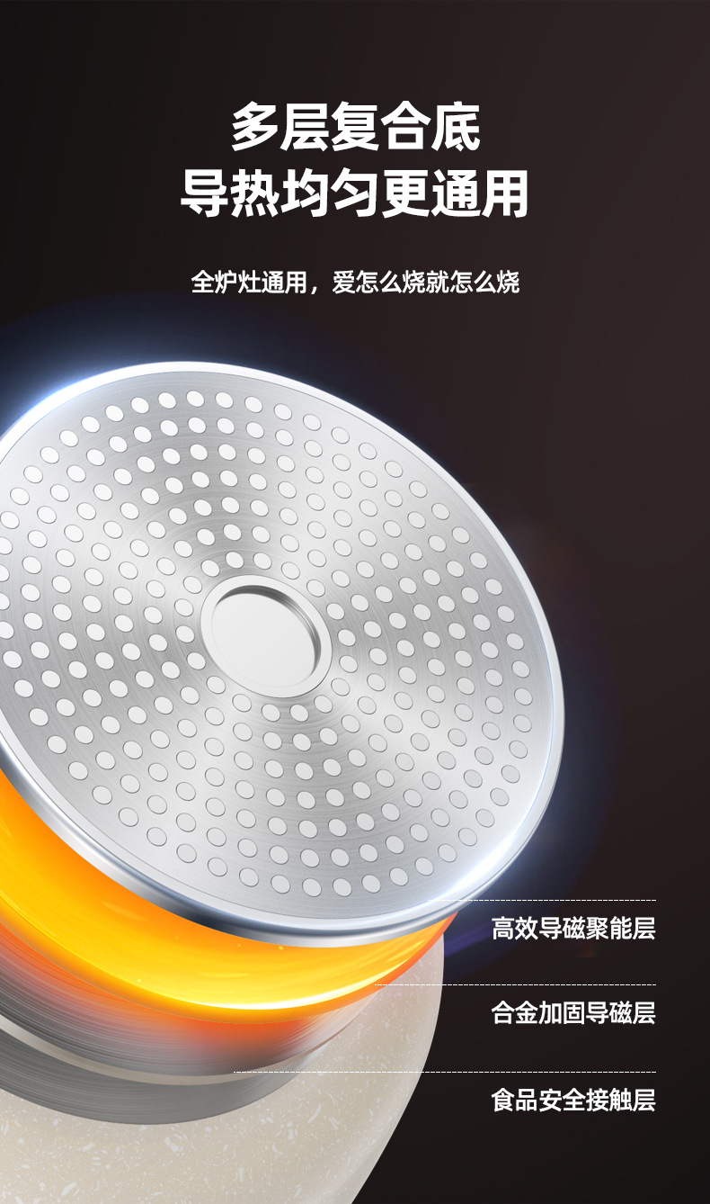 2.不粘厨具传热均匀,使用时只须用中至小火,便可烹调出美味食物。采用大火时,应注意避免烧到把手,且不可干烧,锅内必须有食物或水。