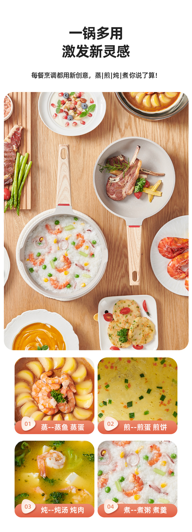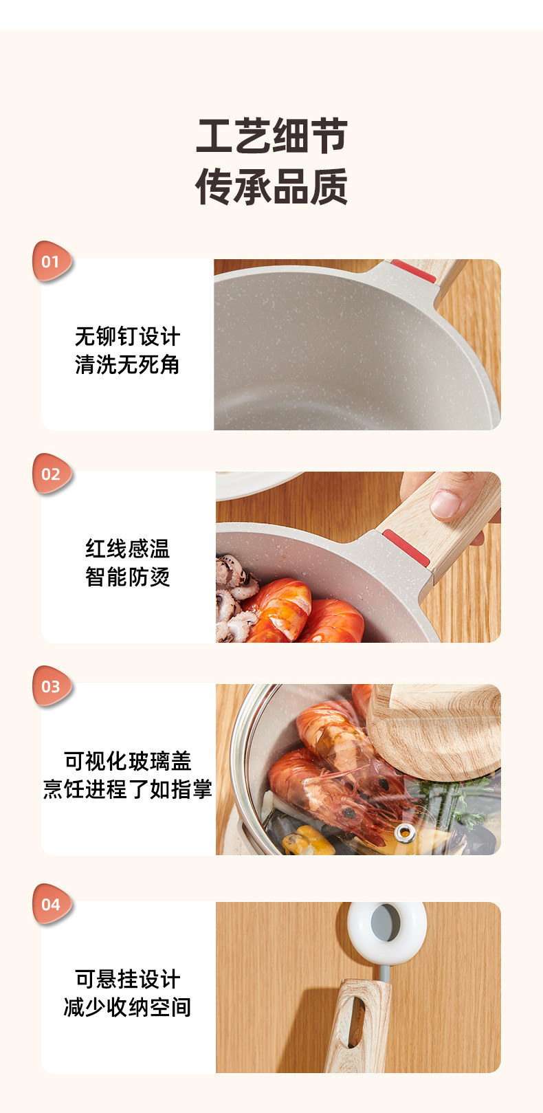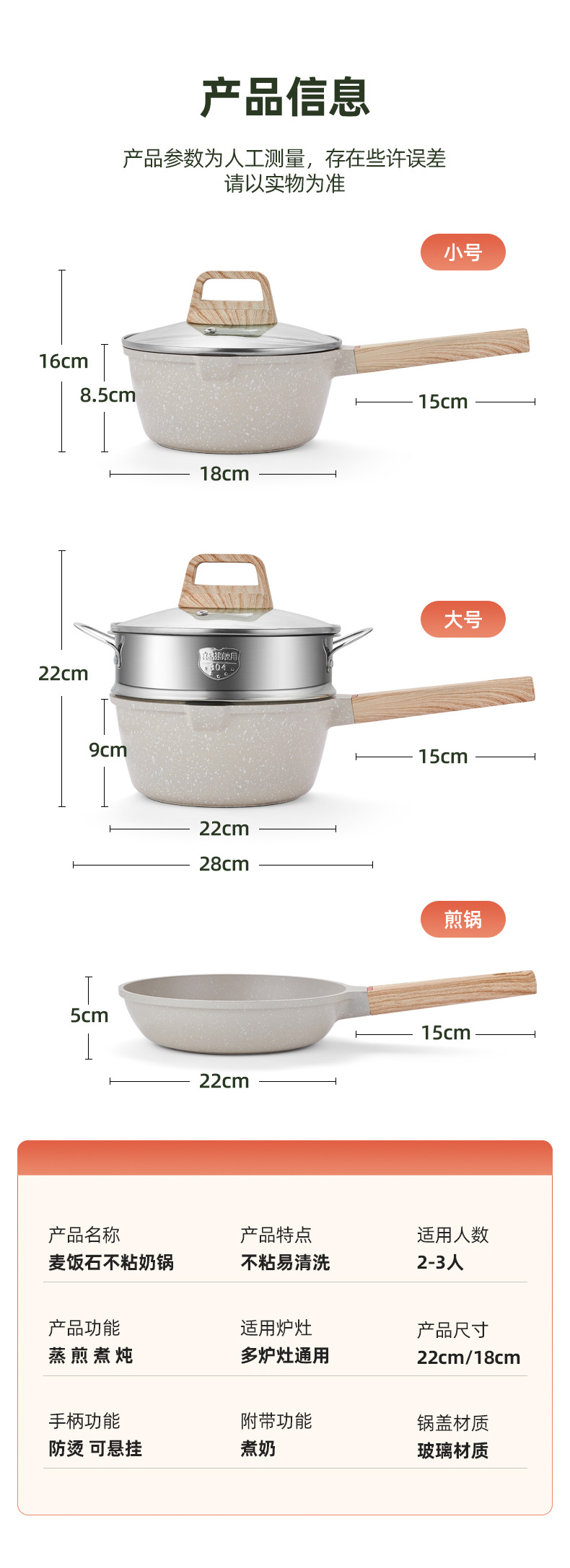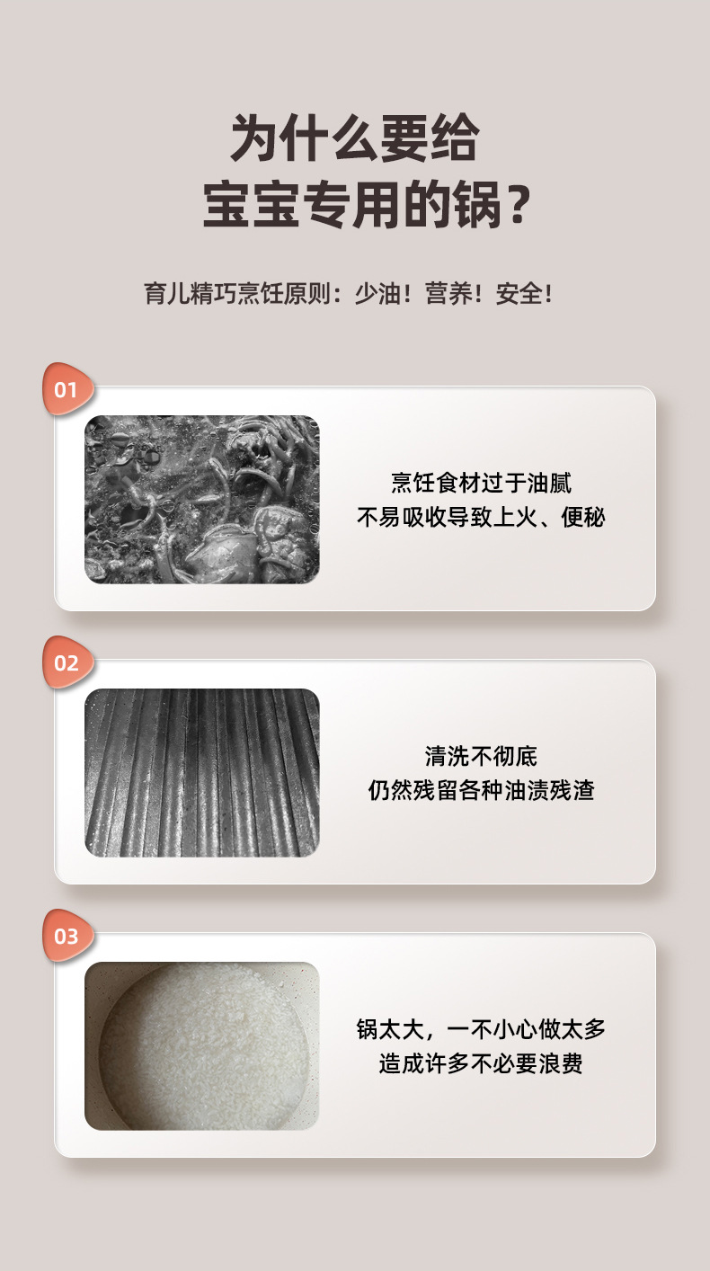 2.不粘厨具传热均匀,使用时只须用中至小火,便可烹调出美味食物。采用大火时,应注意避免烧到把手,且不可干烧,锅内必须有食物或水。