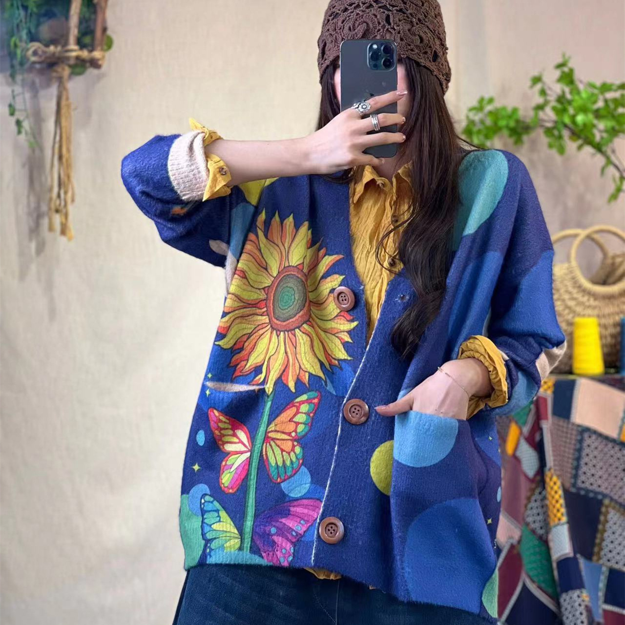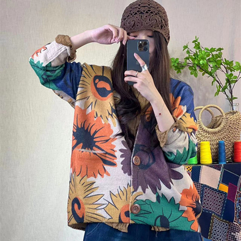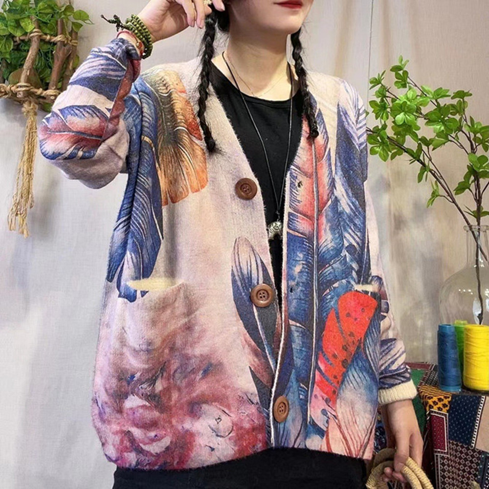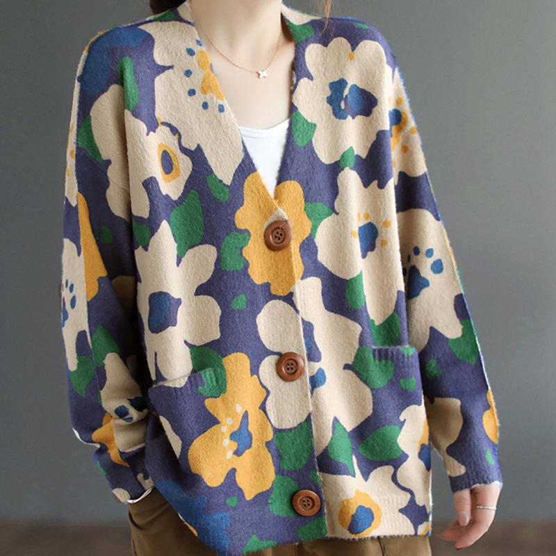 Весна-осень 2025, новый женский вязаный кардиган в художественном стиле из норкового вельвета, с V-образным вырезом, свободного кроя, повседневный.