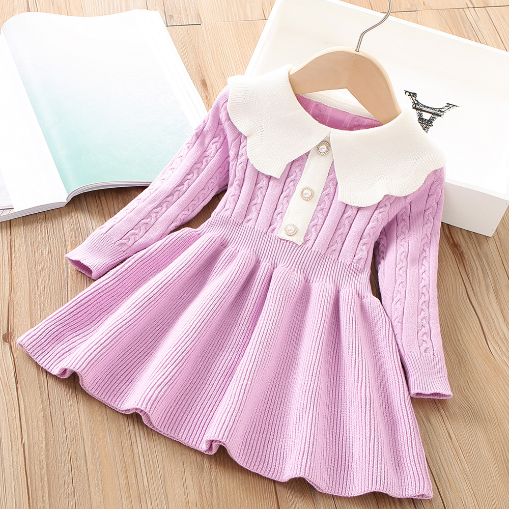 Платье-свитер для девочек 2022 зима Новый корейский стиль в западном стиле, однотонное трикотажное платье принцессы с длинными рукавами для маленькой девочки, модное