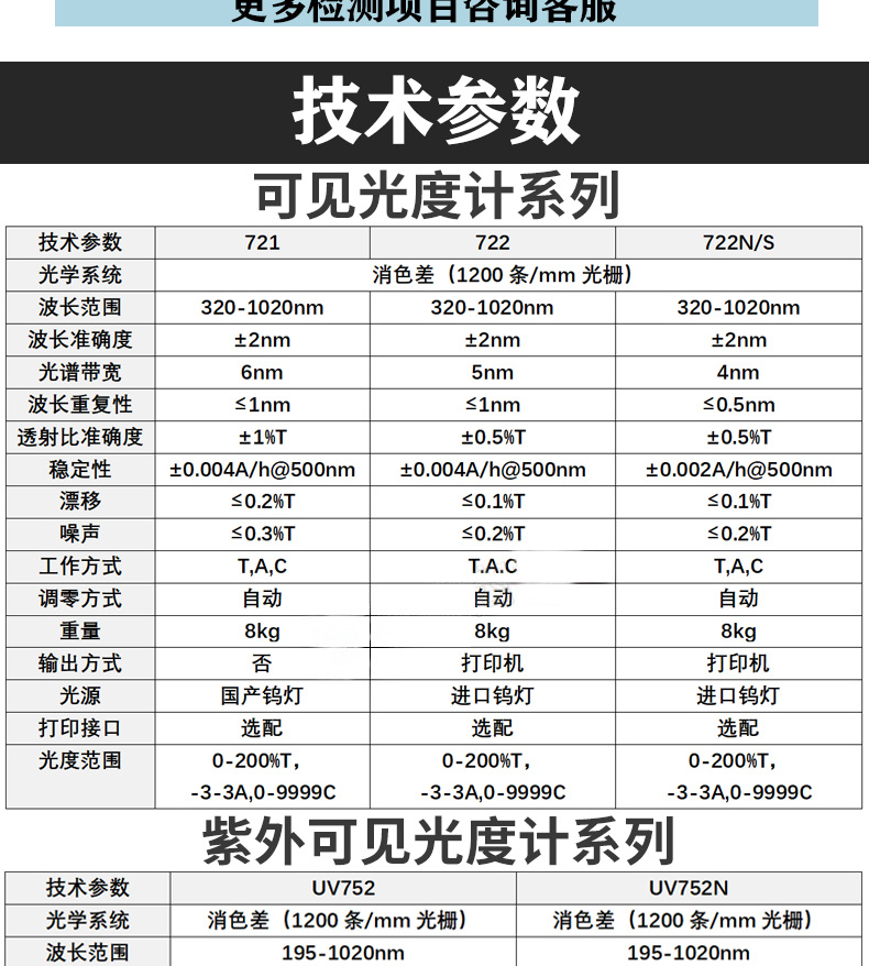 721 видимый свет (6 нм); 721-100 видимый свет (6 нм); 722 видимый свет (5 нм); 722N видимый свет (4 нм); 722S видимый свет (4 нм); Двойной луч с коэффициентом 723N (2 нм); Двойной луч с коэффициентом 7230G (4 нм); Тип сканирования UV729, видимый свет (1,8 нм); UV752 ультрафиолетовый видимый свет (5 нм); UV752N ультрафиолетовый видимый свет (4 нм); UV754N ультрафиолетовый видимый свет (4 нм); UV755B ультрафиолетовый видимый свет (2 нм); UV756 ультрафиолетовый видимый свет (2 нм); UV759 ультрафиолетовый видимый свет (1,8 нм); УФ1810 сканирующий тип ультрафиолетового видимого света (1 нм); УФ1810S сканирующий тип ультрафиолетового видимого света (0,5/1/2/4/5 нм); UV1900 двойной луч (2 нм); UV1901 двойной луч (1 нм); UV1901PCS двойной луч (0,5/1/2/4/5 нм); N5000 УФ-видимый свет; N5000 PLUS УФ-видимый; N5000S PLUS УФ-видимый; N6000 УФ-видимый свет; N6000 PLUS УФ-видимый свет; N6000S PLUS УФ-видимый; Дополнительное программное обеспечение для анализа