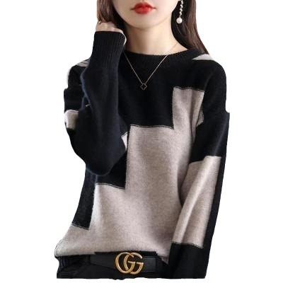 Европейская станция Color Block Шерстяной свитер Женский осенне-зимний Новый Свободный пуловер Свитер с круглым вырезом Вязаный Топ Базовый кашемировый свитер