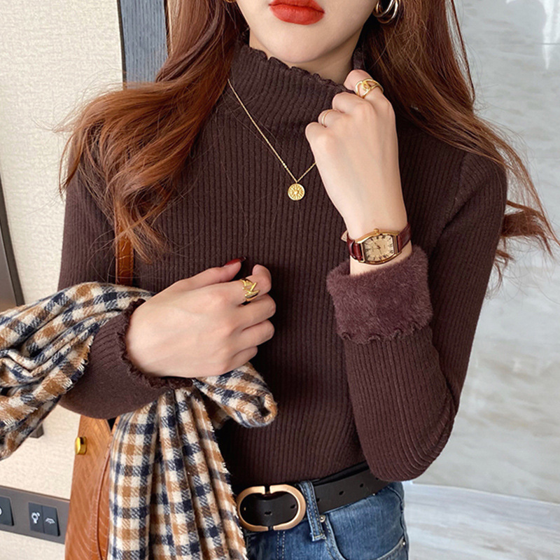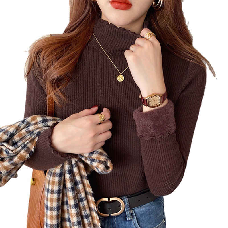 Мягкий свитер в воском стиле, Женская осенне-зимняя вязаная Базовая рубашка с воротом, теплая внутренняя утепленная цельная бархатная верхняя часть с флисовой подкладкой