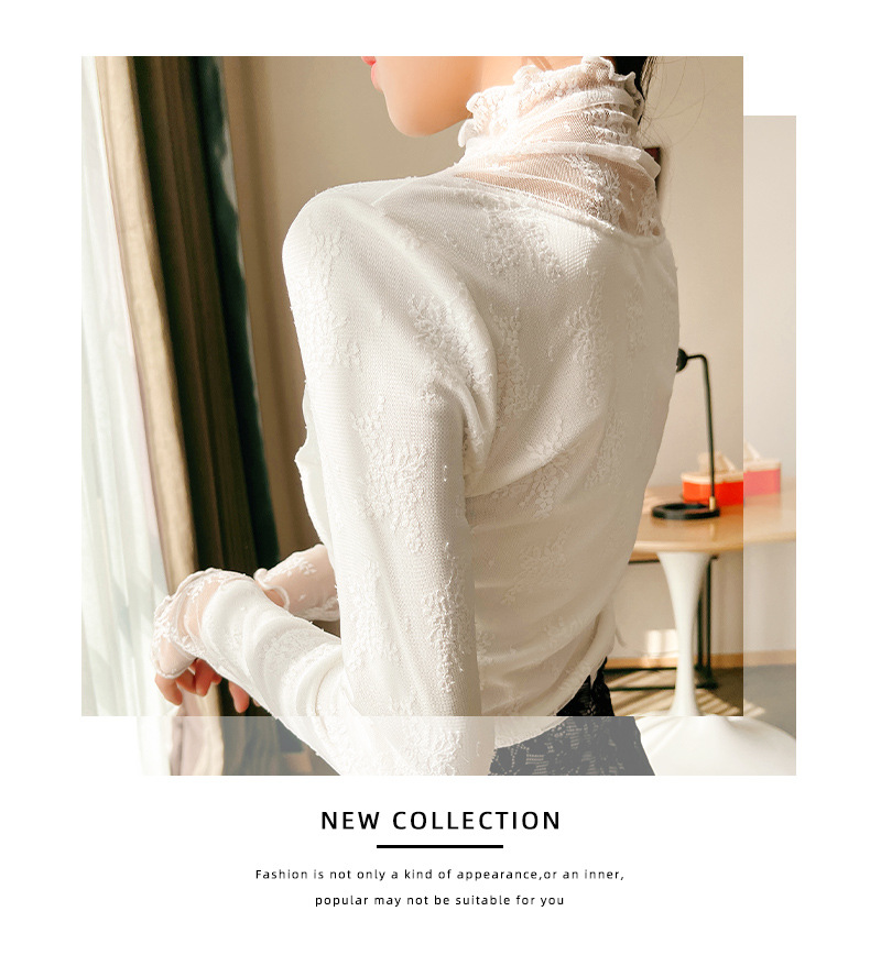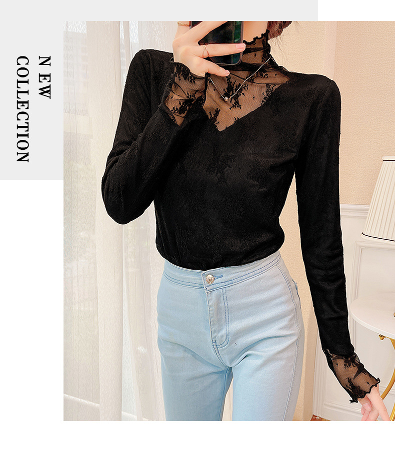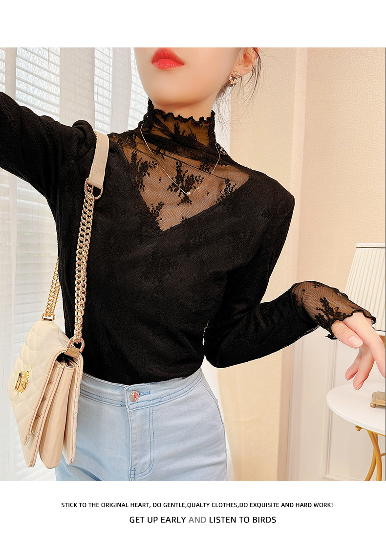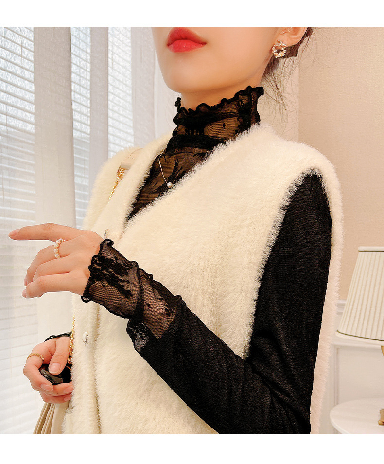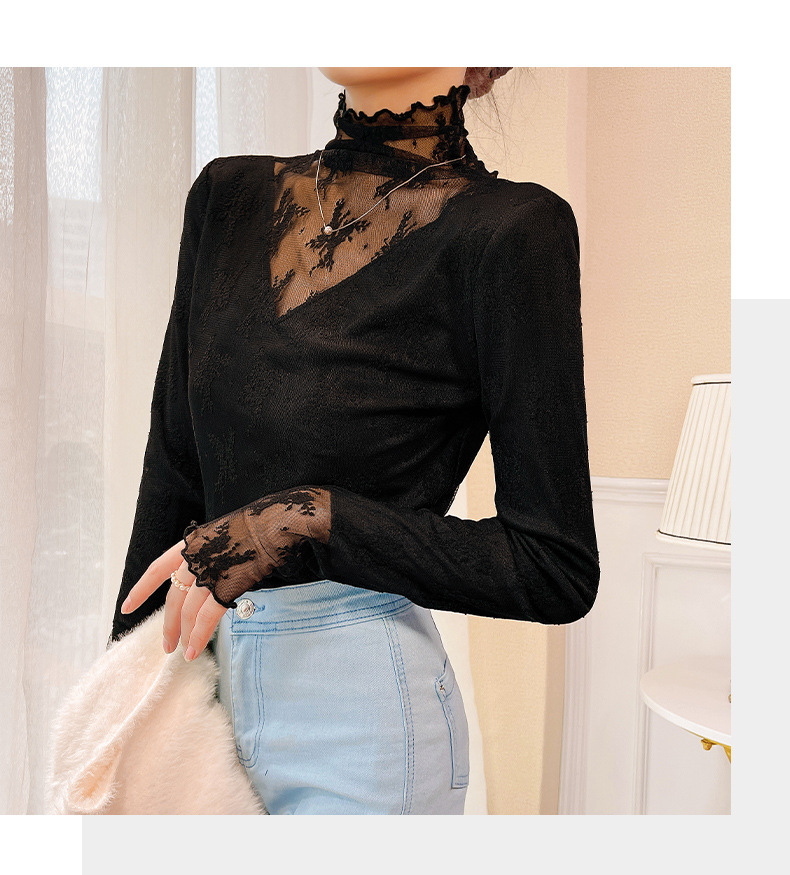 Женская Базовая кружевная рубашка с высоким воротником и флисовой подкладкой, привлекательный сетчатый топ в западном стиле с утолщенной внутренней ушной окантовкой