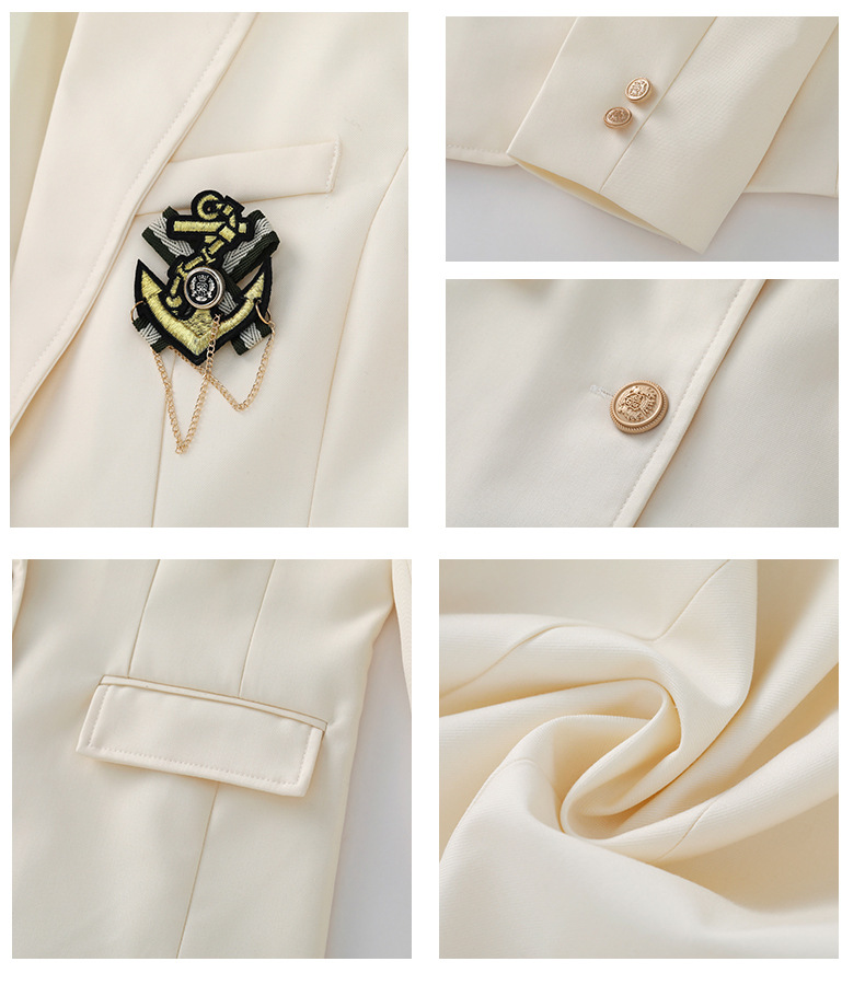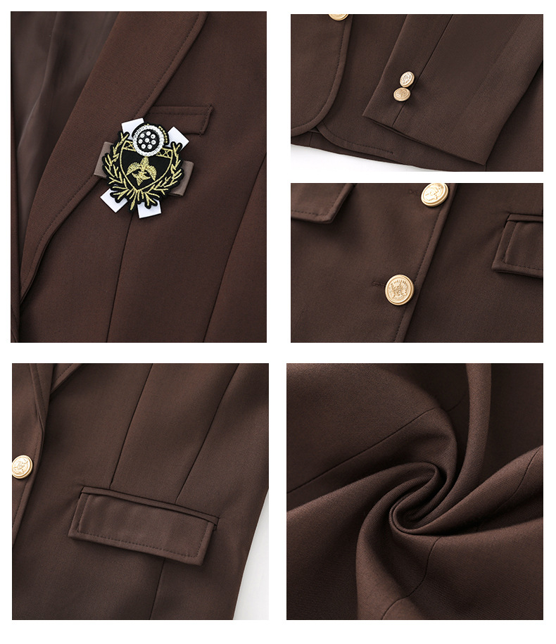 Черный (только костюм); Темно-синий (только костюм); Пламенный коричневый (только костюм); Кремово-абрикосовый цвет (только для костюмов); Серый (только костюм); Черный костюм +1#значок; Черный костюм +6#значок; Темно-синий костюм +2#значок; Плодородный костюм +5#значок; Кремовый абрикосовый костюм +3#значок; Серый костюм +4#значок