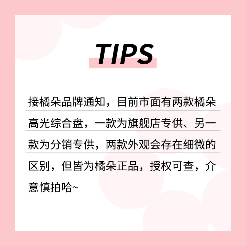 接橘朵品牌通知,目前市面有两款橘朵高光综合盘,一款为旗舰店专供、另一款为分销专供,两款外观会存在细微的区别,但皆为橘朵正品,授权可查,介意慎拍哈~