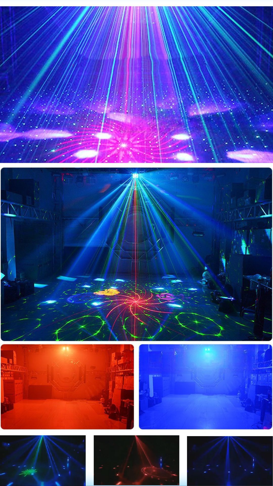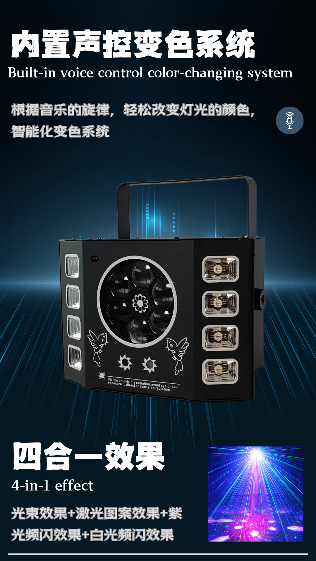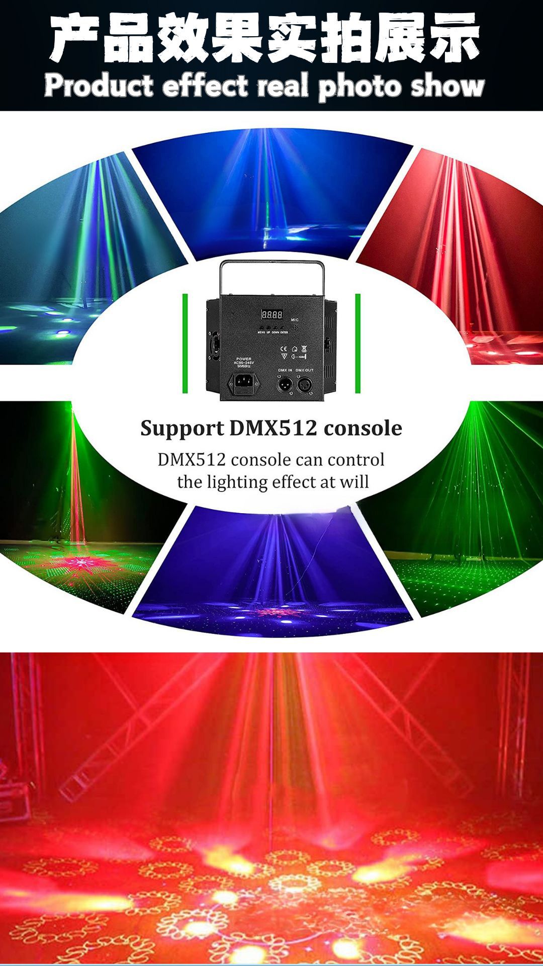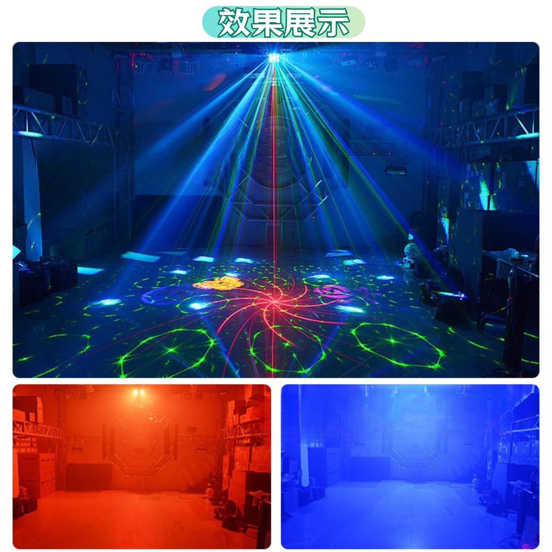 光源:6个10瓦4合1,8个3瓦2合1紫色闪烁灯,50毫瓦红色绿色激光。