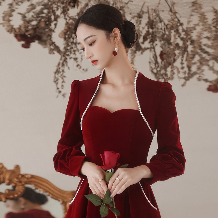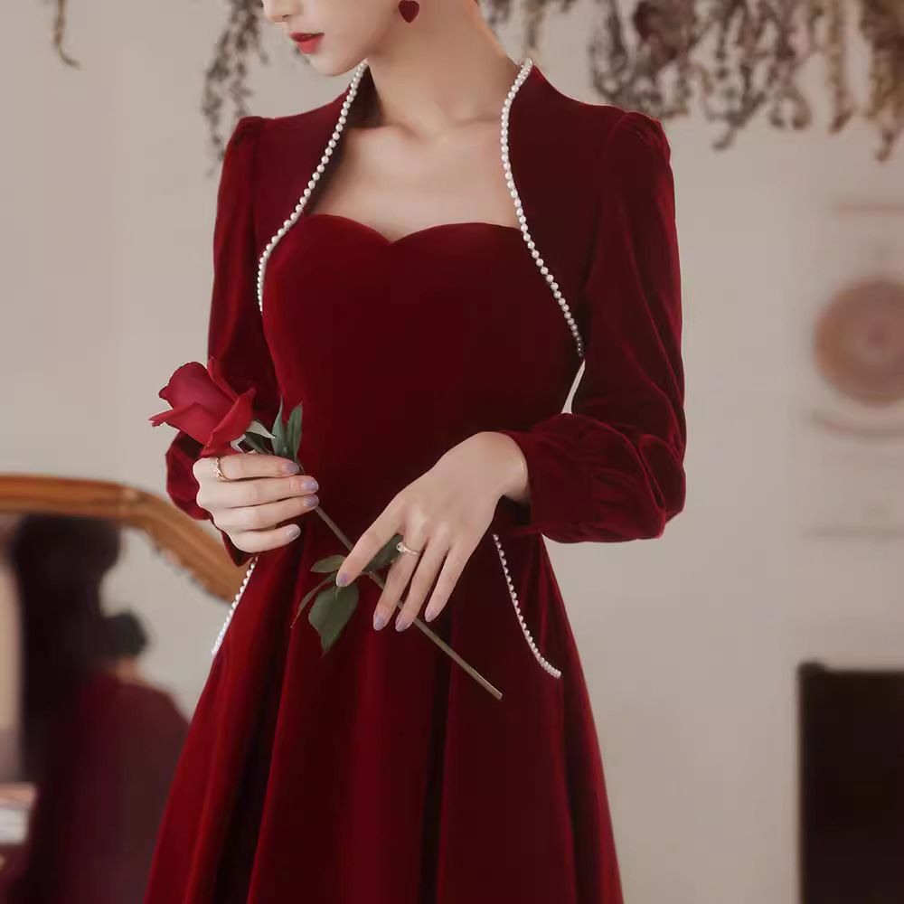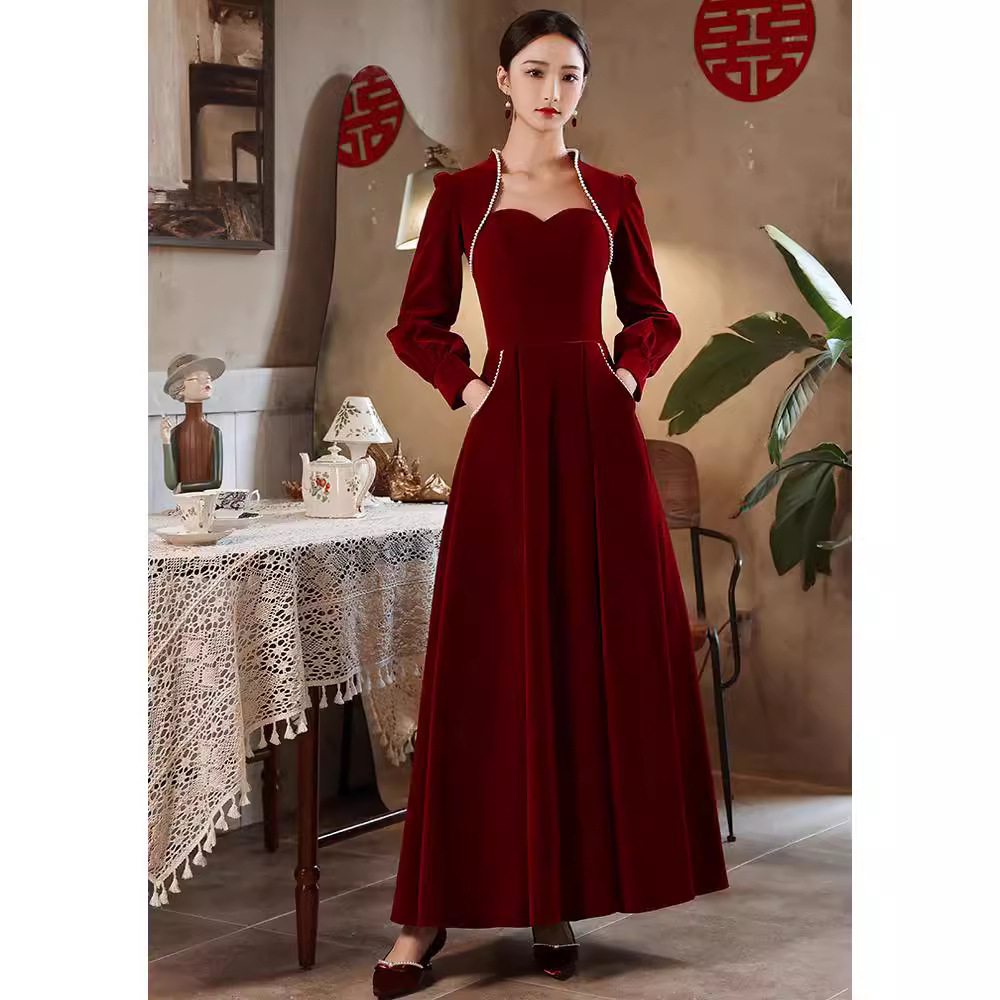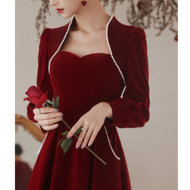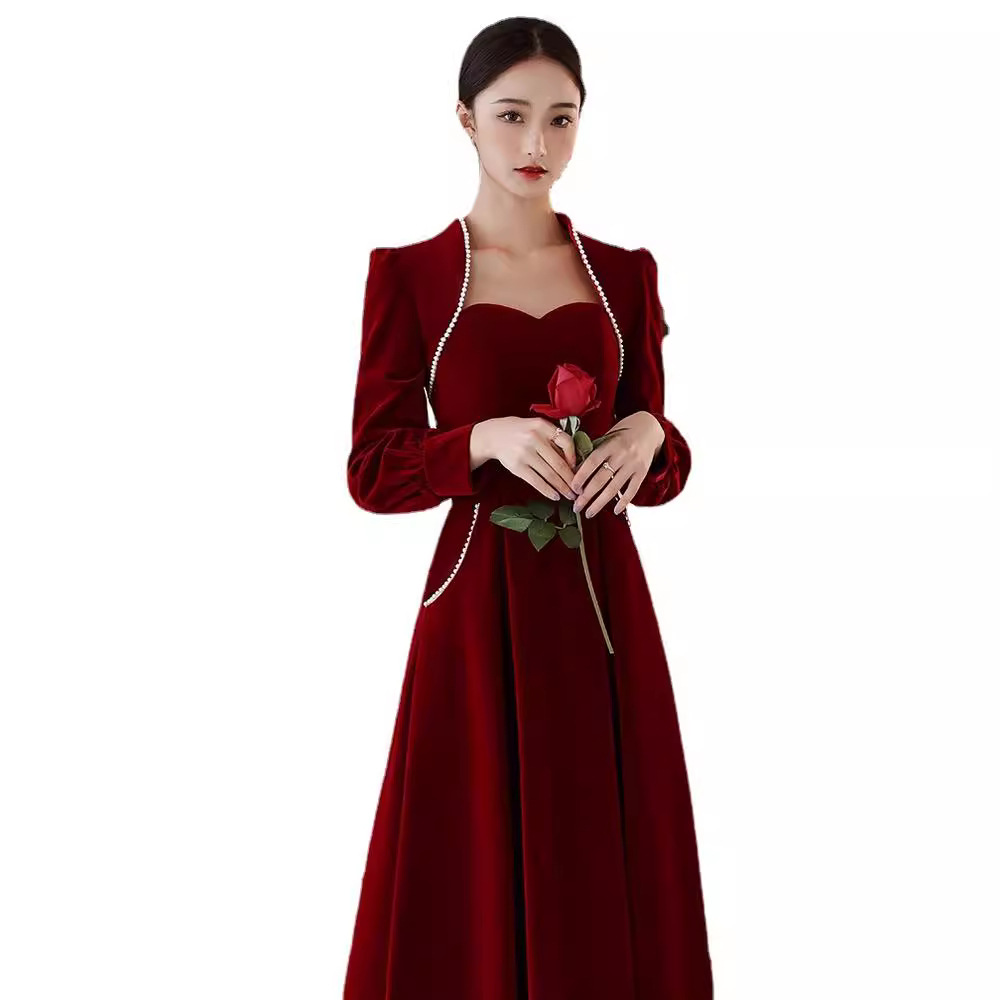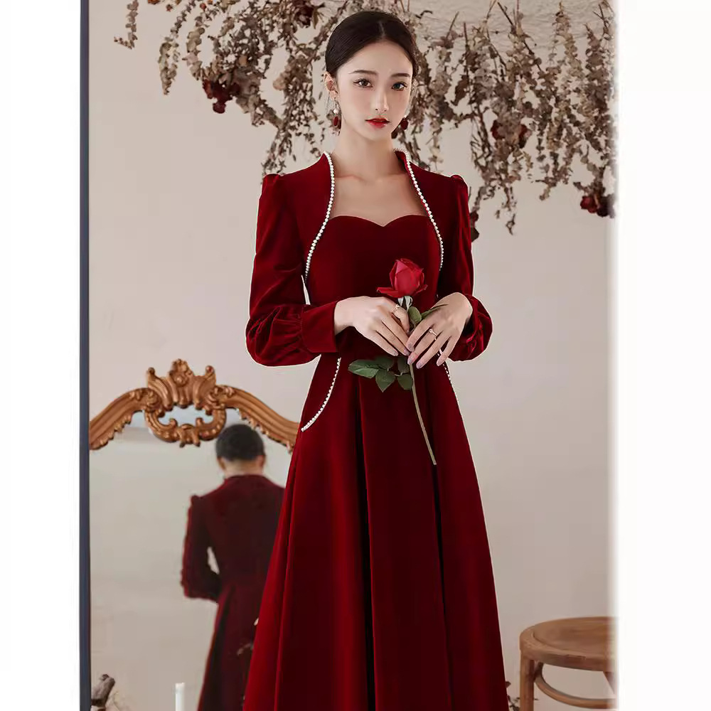 Поджарочный костюм невесты 2024 новый винно-красный помолвка юбка бархатный с длинными рукавами