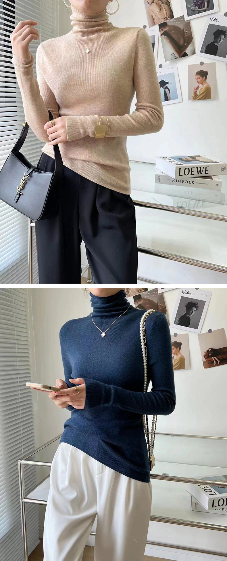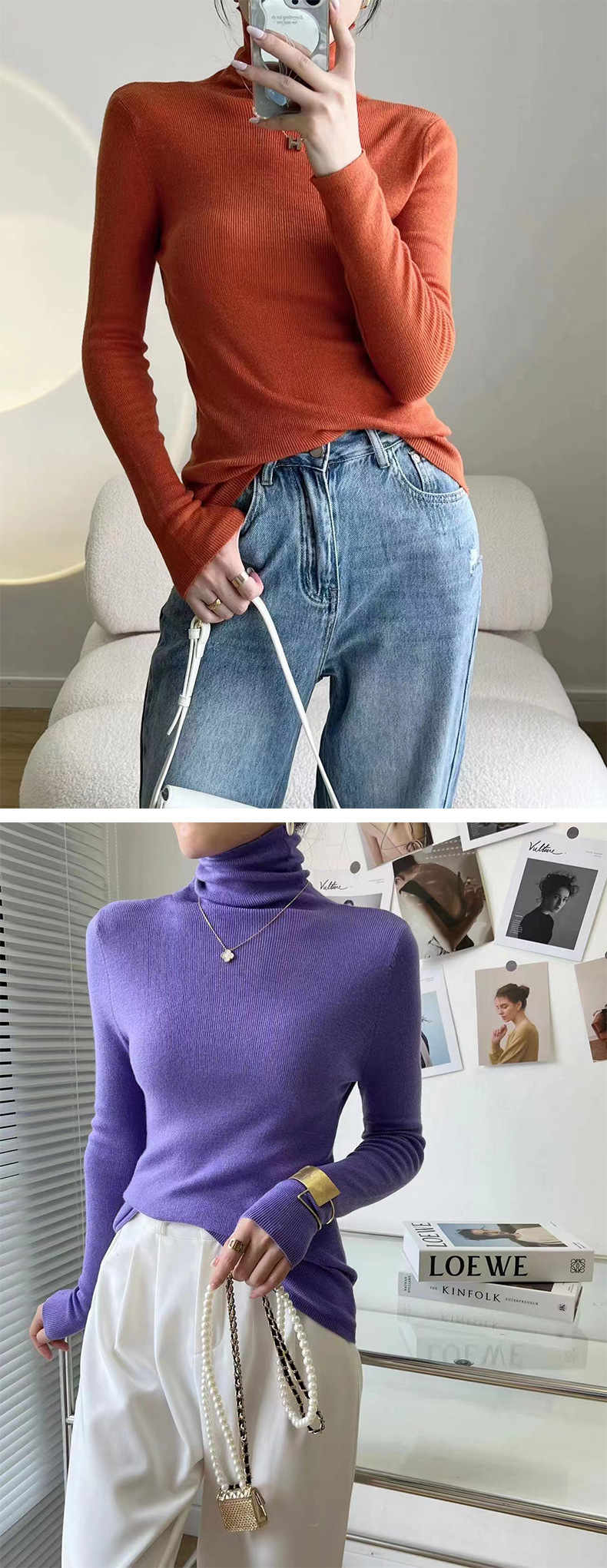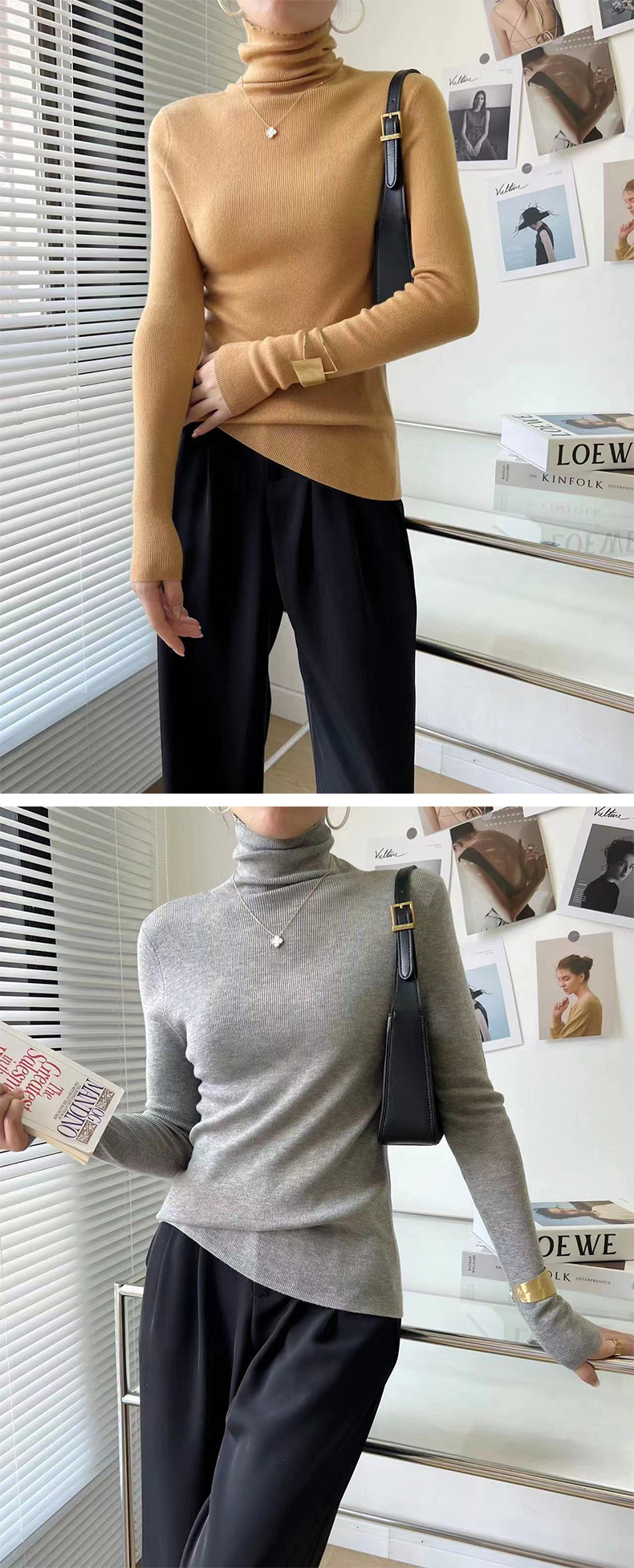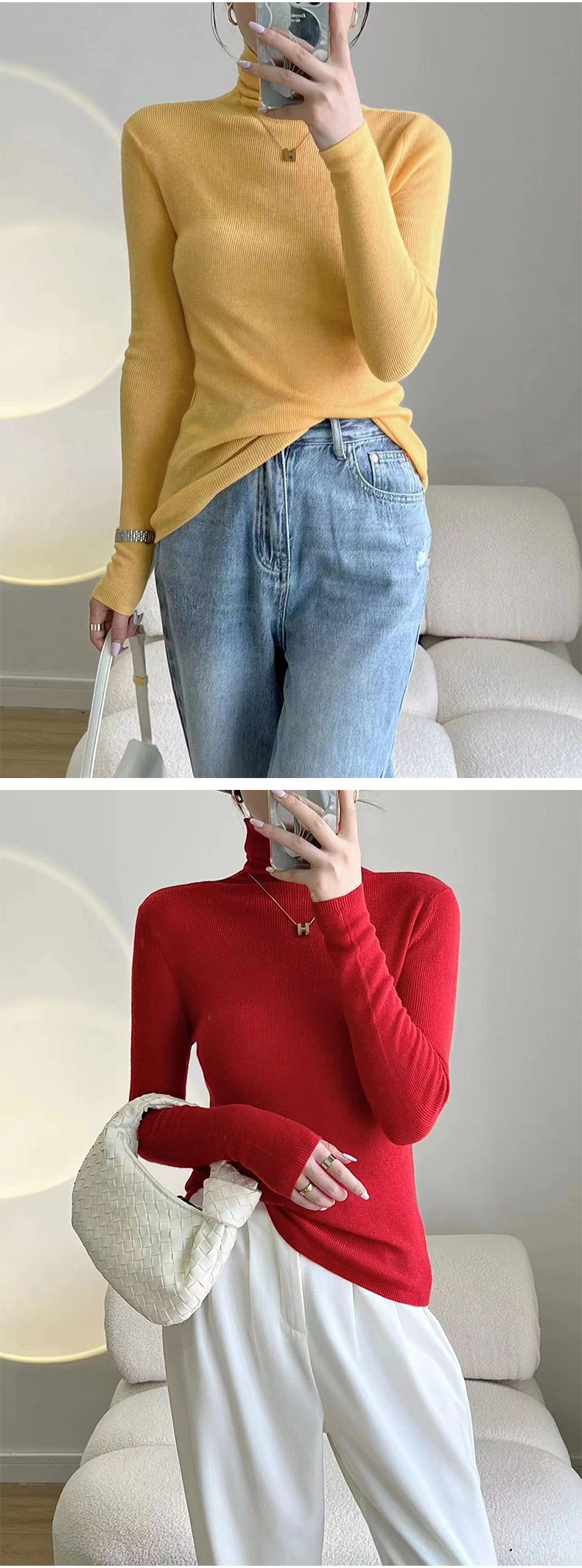 Оптовая продажа дропшиппинга женского вязаного свитера Puyuan со стопкой воротника, разноцветной шерстяной женской базовой рубашки, мягкого женского топа чистого цвета.