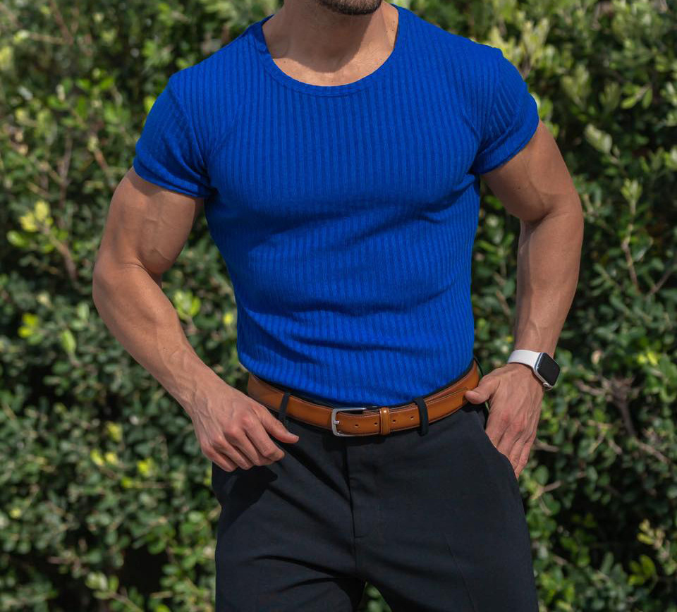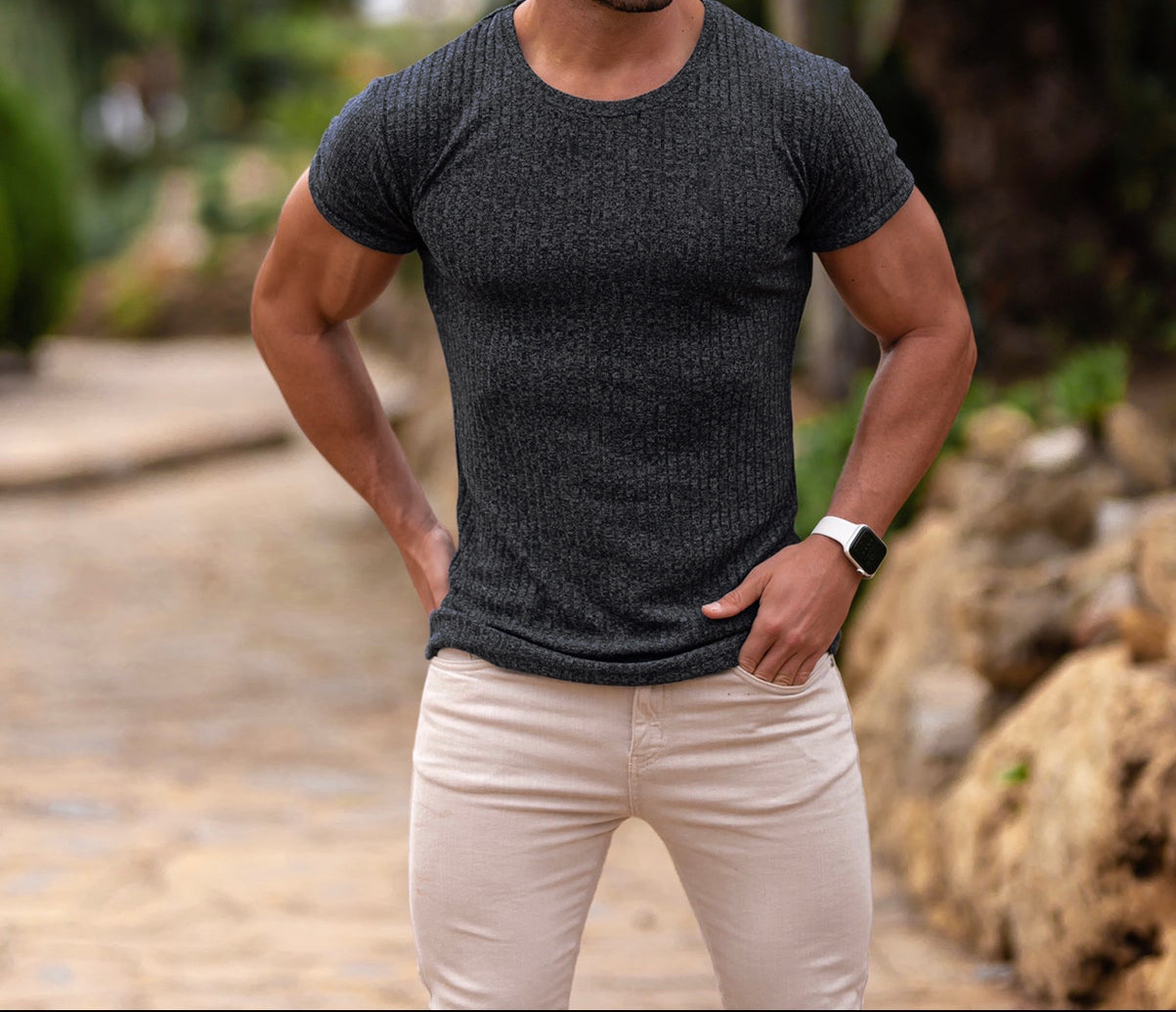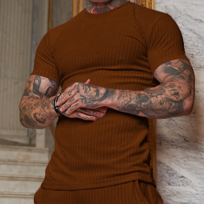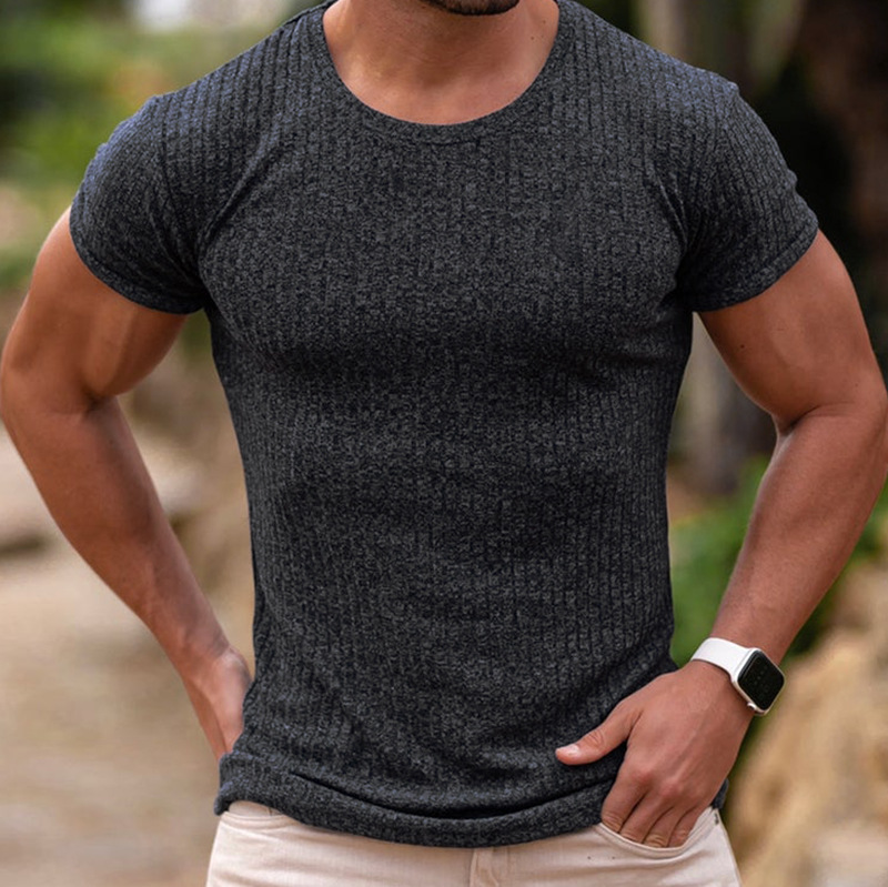Мужская летняя спортивная футболка с коротким рукавом и круглым вырезом, эластичная, с вертикальными полосками, для фитнеса и повседневной носки, в европейском и американском стиле, для международной торговли.