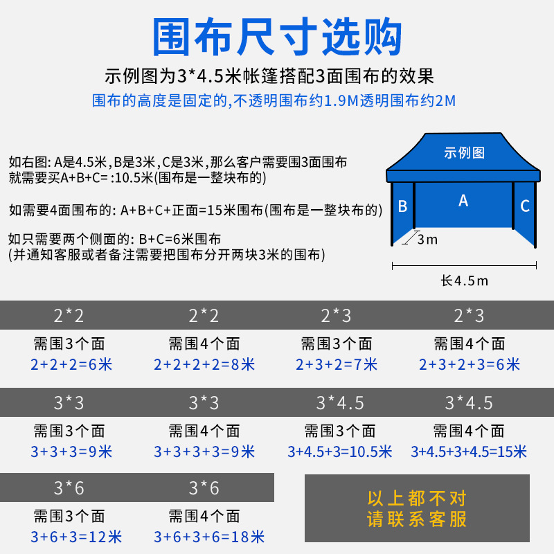 围布常用规格:宽度单位(3米,6米,9米,12米)四个规格去下单,高度约1.95米。