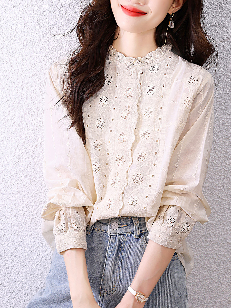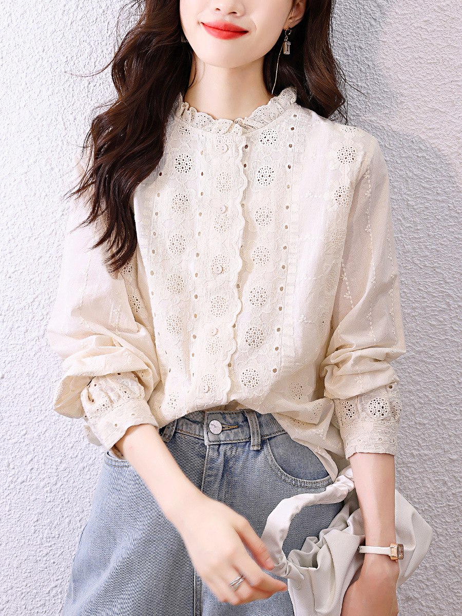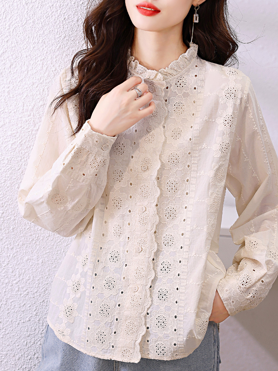 Женская рубашка 2026 года, весенняя новинка, с кружевным воротником-рюшами, абрикосового цвета, с длинным рукавом, вышивка, цветочный узор, из чистого хлопка