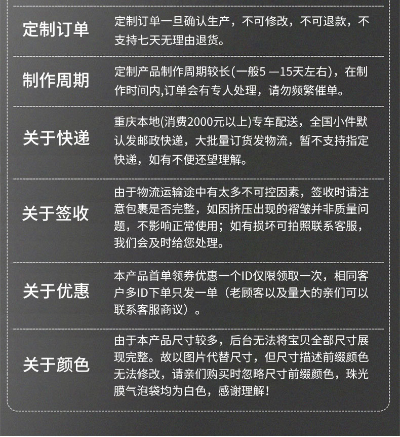 袋子尺寸为外径尺寸,产品长/宽尺寸存在士5mm,平方克重 ±10g的公差,介意者慎拍!