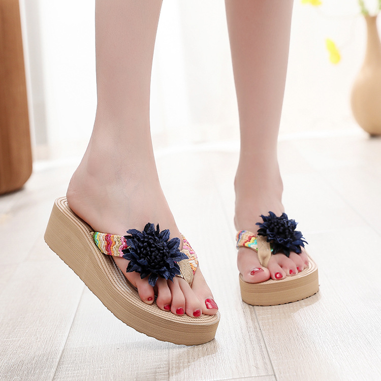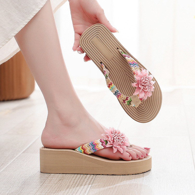 Женские шлепанцы из искусственной соломы, плетеные из полипропилена, летняя модная верхняя одежда, пляжные шлепанцы на танкетке, цветочные толстые подошвы