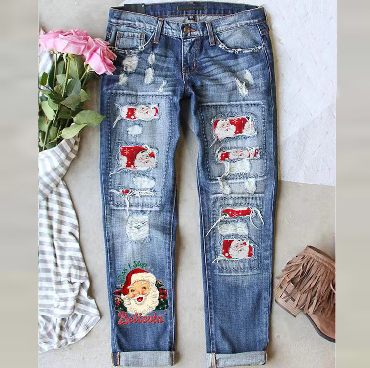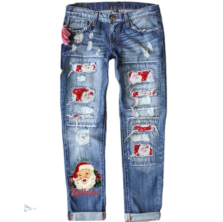 2022 Европейская и американская трансграничная независимая станция Amazon новые зимние рождественские джинсы с принтом рваные утолщенные брюки