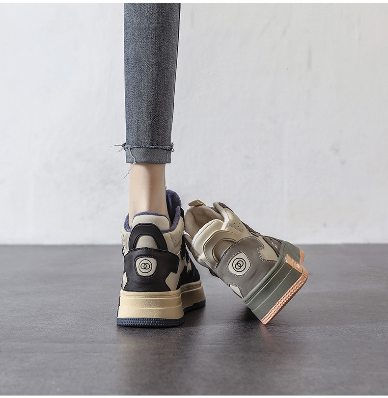 Женские высокие туфли из натуральной кожи, осенне-зимние кроссовки на толстой подошве с цветными блоками, новый стиль 2025 года, повседневная спортивная обувь в стиле ins на флисовой подкладке для женщин.