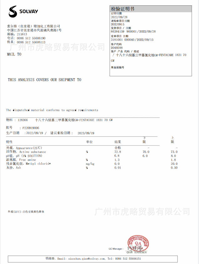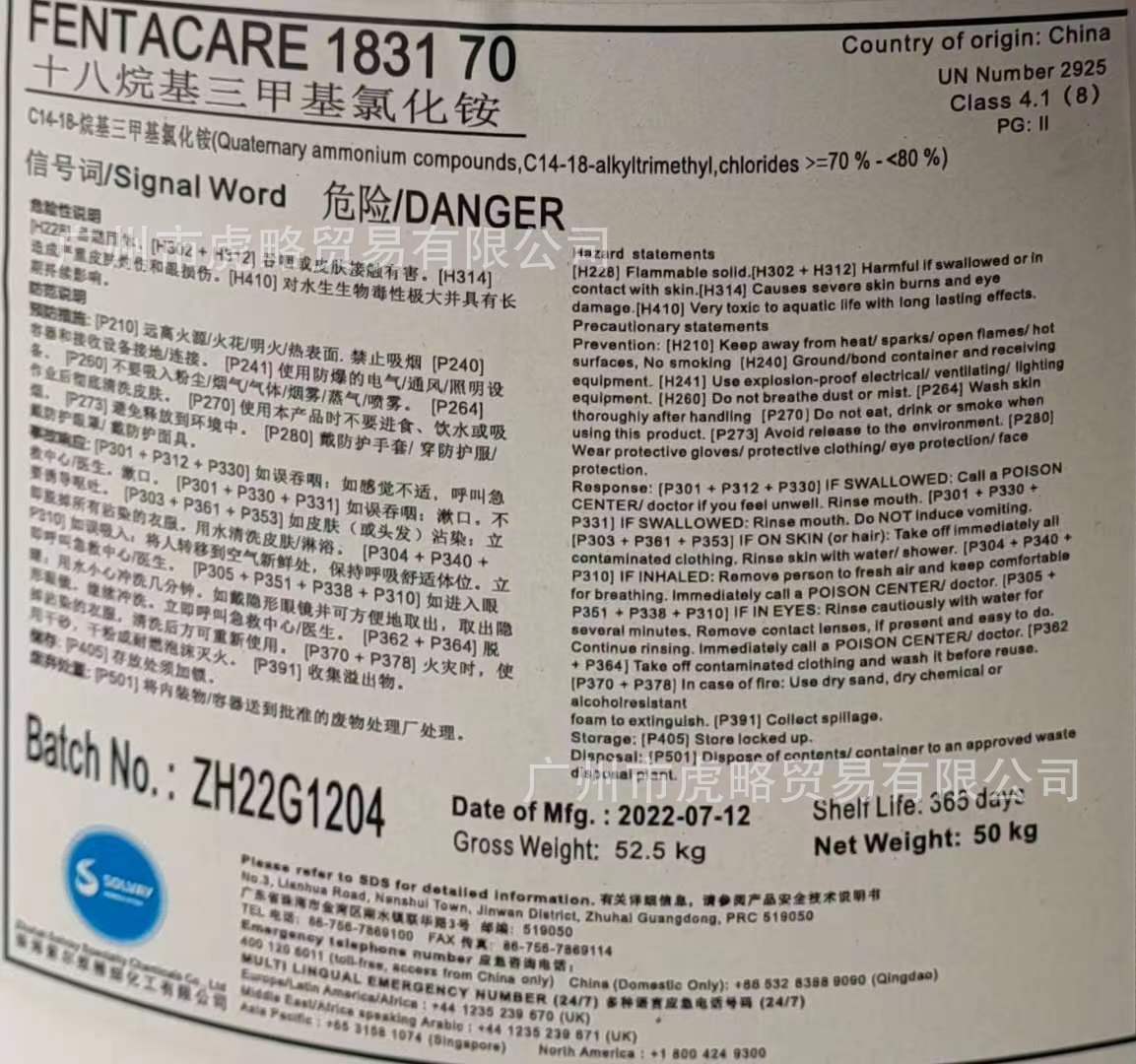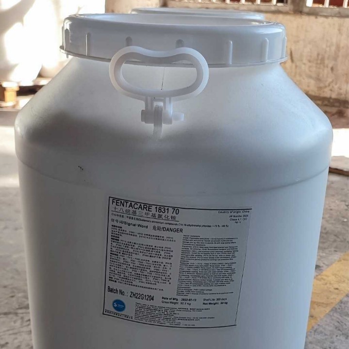 由18/16叔胺与氯甲烷反应合成。18/16叔胺的比例一般是70%:30%。生产的溶剂有纯酒精、酒精与水按比例混合两种。用这两种溶剂生产出来的产品都是膏体。纯酒精产品较稀,流动性较好。