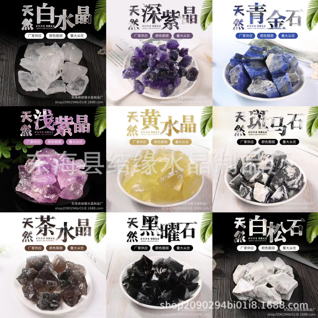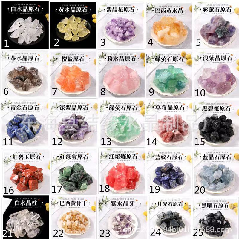 Розовый кристалл; Голубой камень; Клубничный кристалл; Красная яшма; Цитрин; Зеленый флюорит; Солнечный камень; Камень Зебра; Туман Белый Кристалл; Темный фиолетовый; Ляпис; Светло фиолетовый; Чайный кристалл; Обсидиан; Белый камень сосны; "Тигровый глаз"; Зеленый Восточный Мавзолей; Фиолетовая слюда; Камень Тяньхэ; Хуан Донглин; Опал; Цвет флюорит; Соль апельсина; Черный Турмалин; Красное и зеленое сокровище; Лаблагит; Красный плавильного камня; Красный Орпо; Прозрачный корпус белый кристалл; Темно синее стекло; Светло голубое стекло; Темно зеленое стекло; Светло зеленое стекло; Бразильские зубы цитрина; Бразильский ксантозит