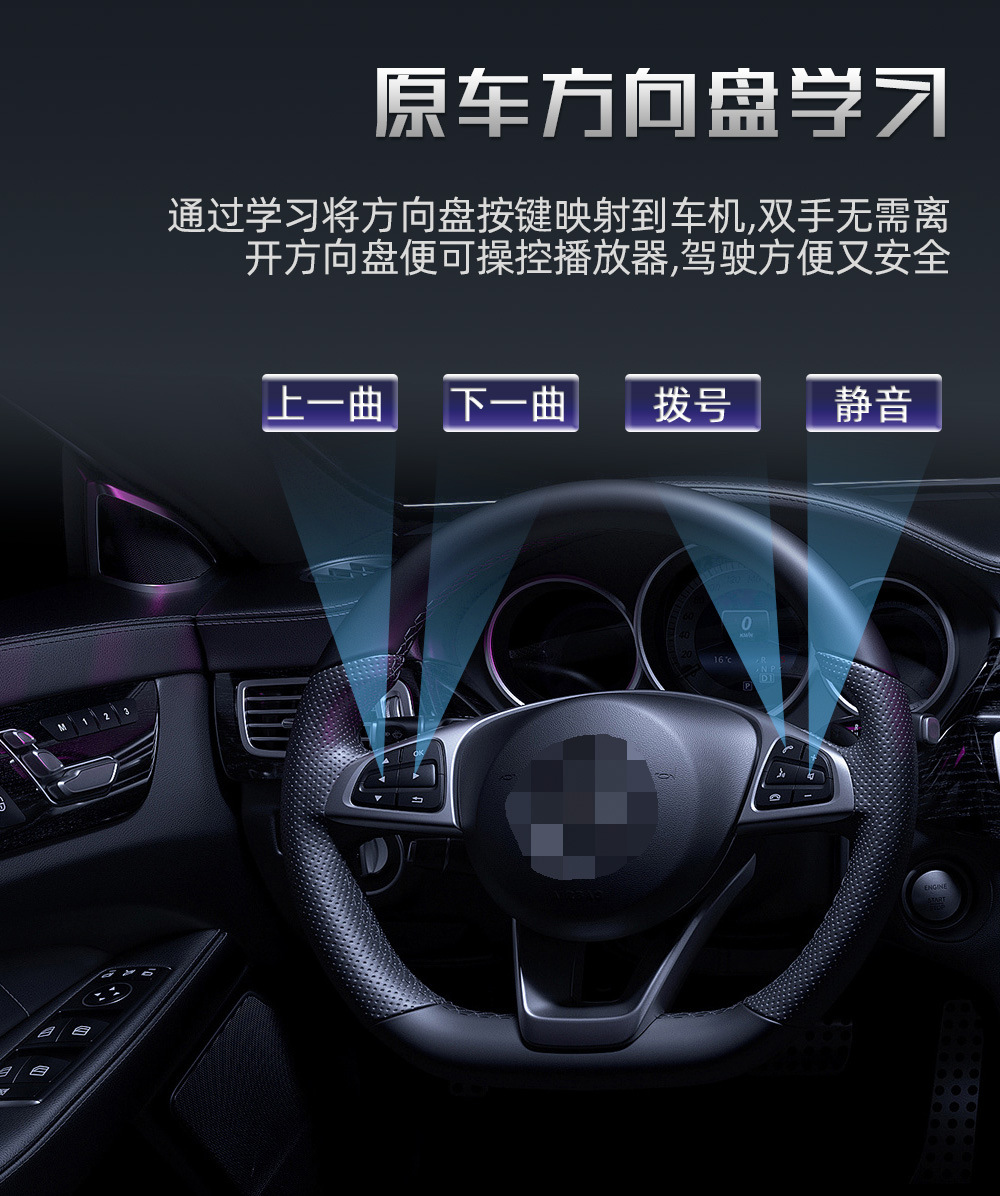 ♦通过学习将方向盘按键映射到车机,双手无需离开方向盘便可操控播放器,驾驶方便又安全