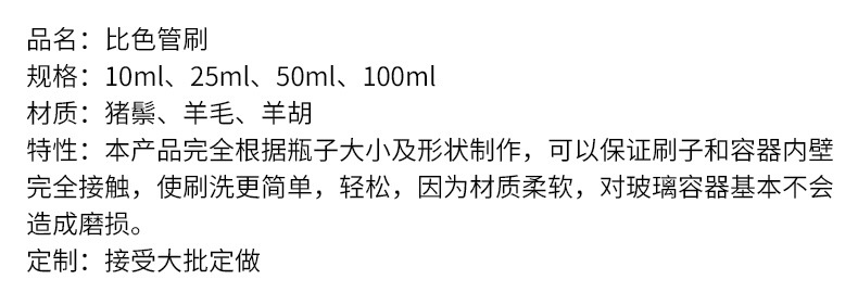 Кисть для пробирок 13*130мм; Щетка для пробирок 15*150мм; Щетка для пробирок 18*180мм; Колориметрическая кисть-тюбик 10мл.; Колориметрическая кисть-тюбик 25мл.; Колориметрическая кисть-тюбик 50мл.; Колориметрическая кисть-тюбик 100мл.
