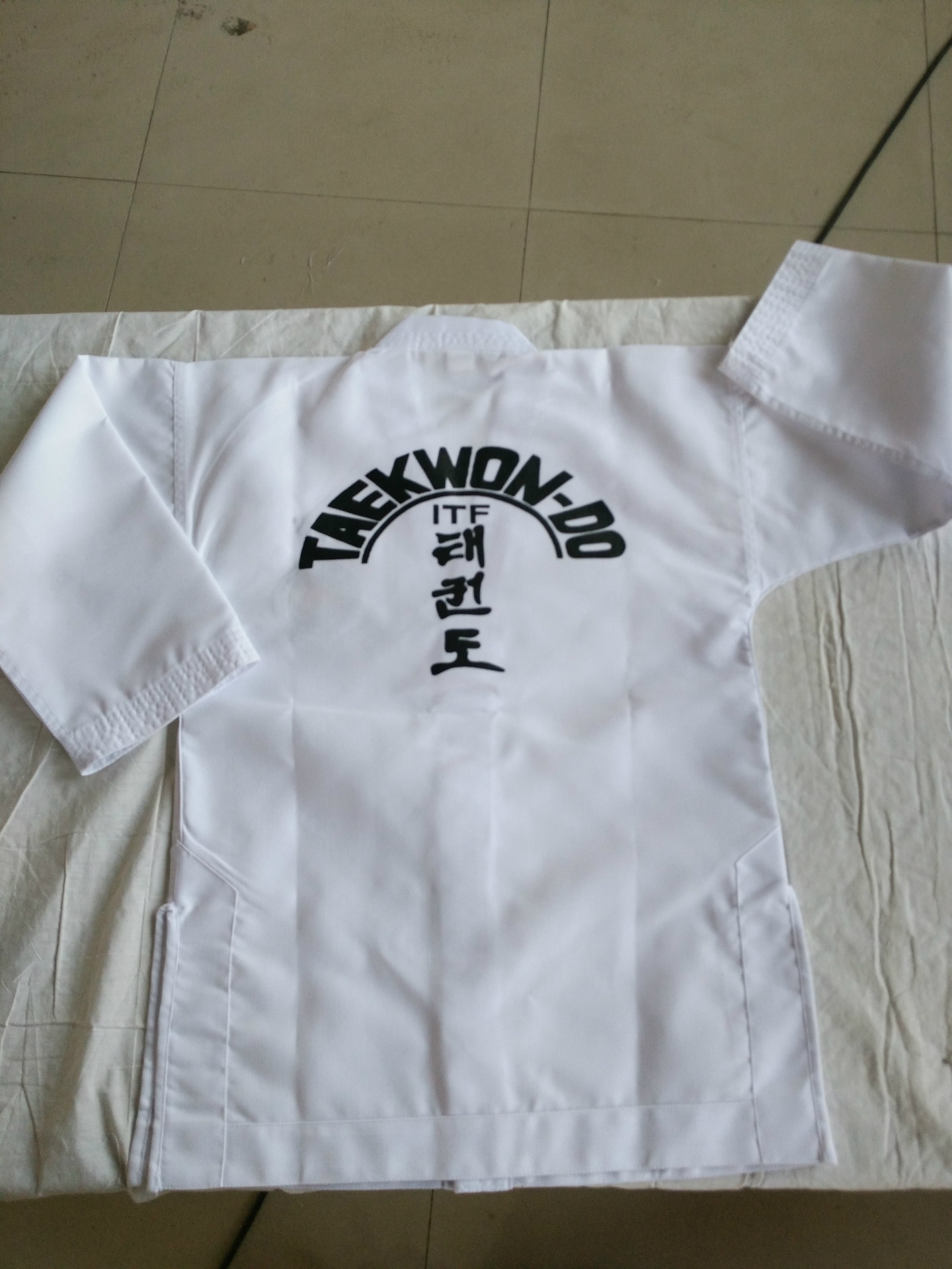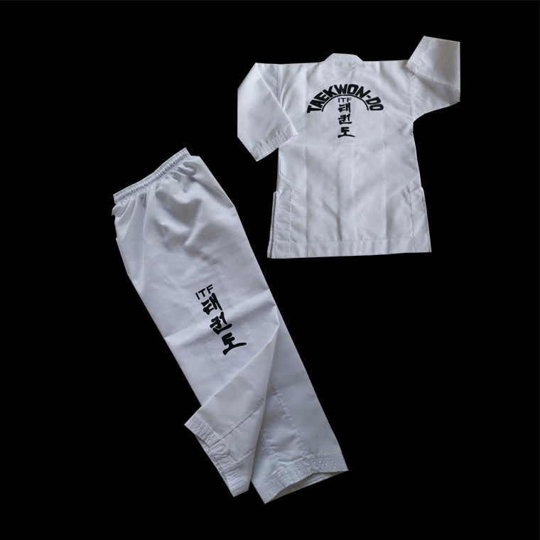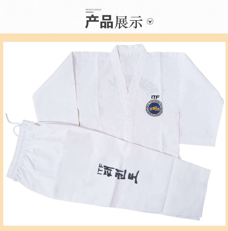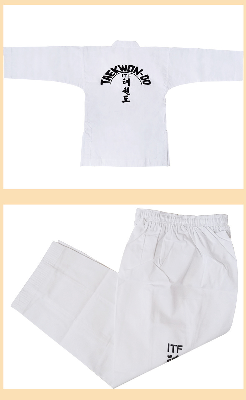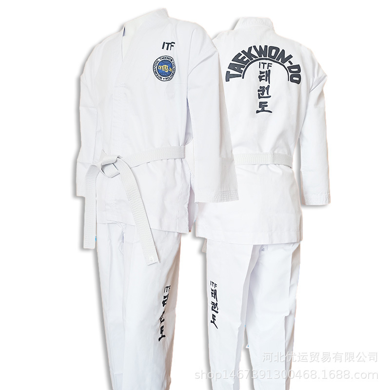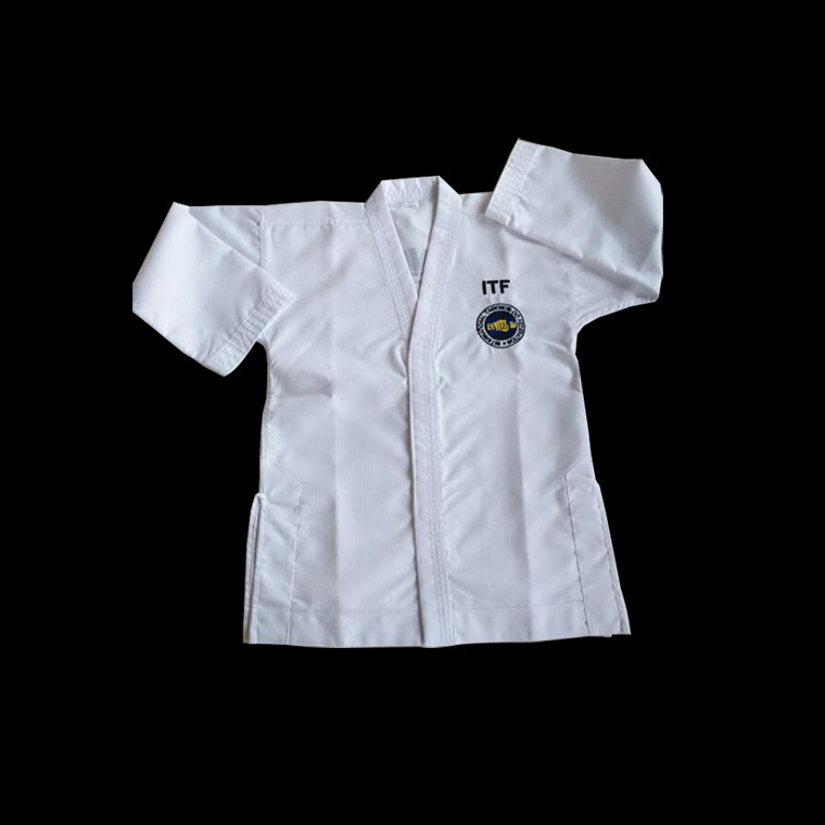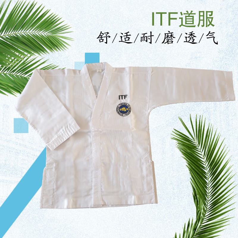 Униформа ITF для тхэквондо для детей и взрослых, тренировочная форма из полосатой ткани, готовая оптовая продажа, униформа для тхэквондо с вышивкой и принтом, удобная