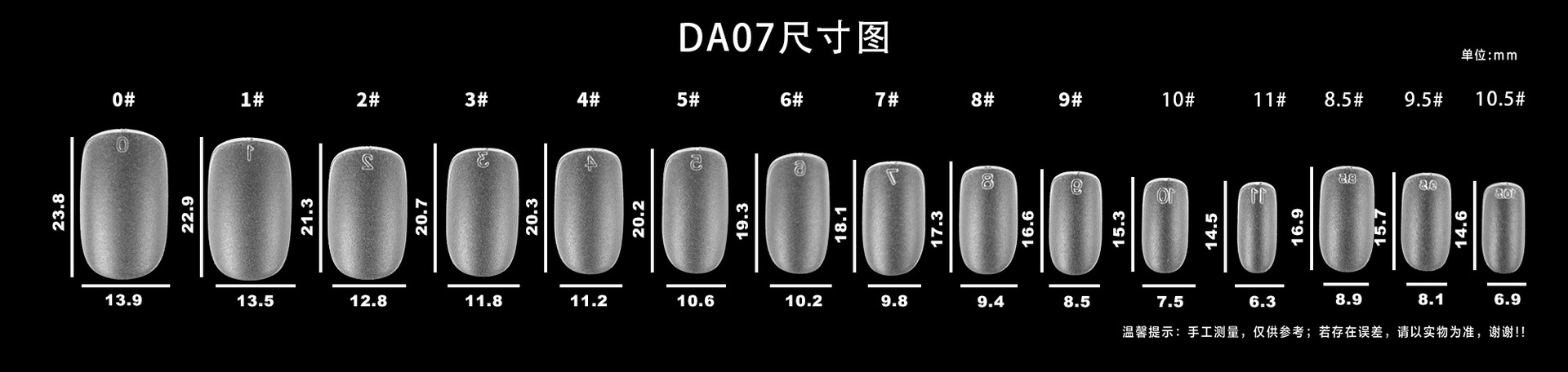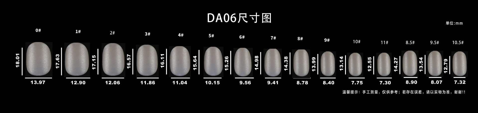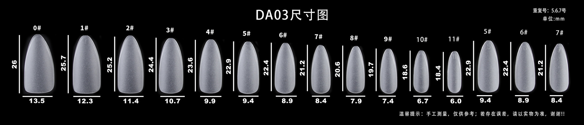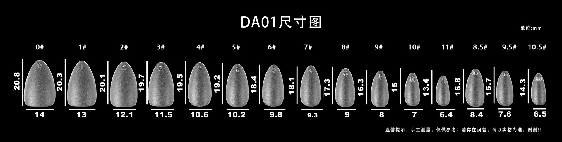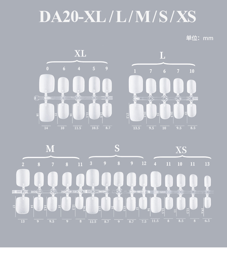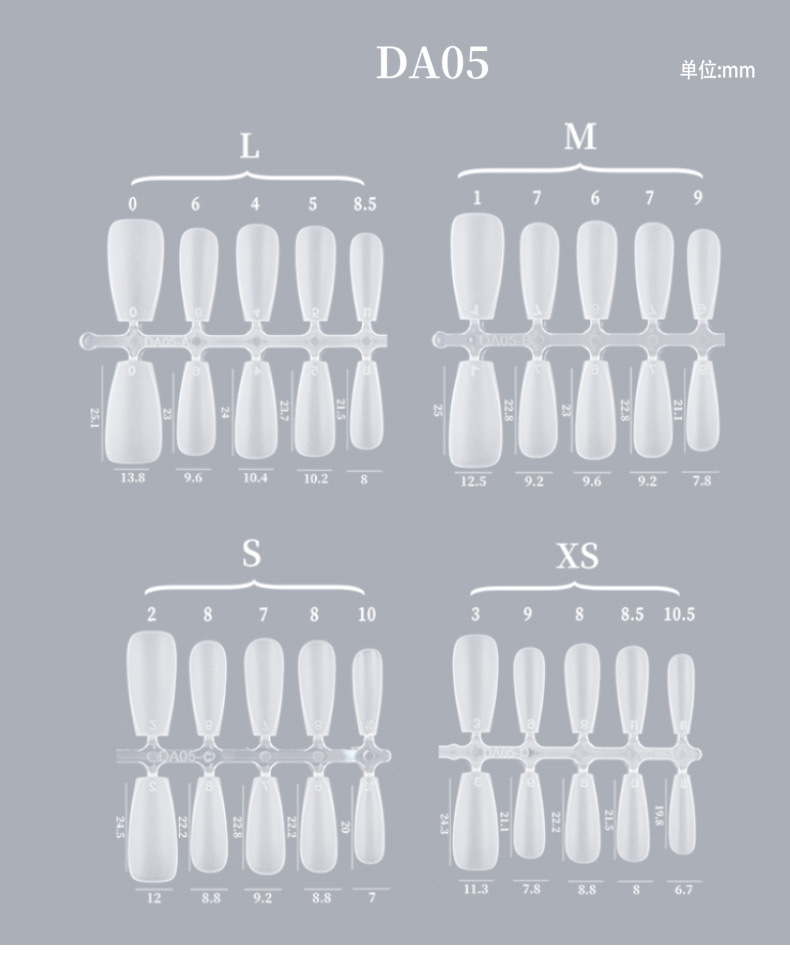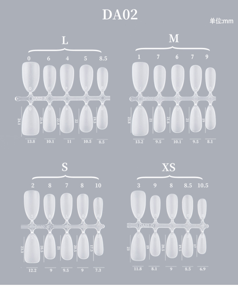 DA01 ультракороткие капли воды; DA02 короткая капля воды; DA03 капля воды средней длины; DA04 короткая трапеция; DA05 трапеция средней длины; DA06 маленький короткий круг; DA07 средний овал; DA08 средний прямоугольный; DA11 длинная капля воды; DA12 длинная трапеция; DA13 короткая квадратная головка; DA14 средняя прямоугольная головка; DA15 короткий овал; DA16 овал средней длины; DA17 длинная капля воды; DA19 короткий миндаль; DA20 короткая квадратная броня; DA21 средняя прямоугольная броня; DA22 миндаль средней длины; DA23 короткий квадратный круг; DA25 длинная трапеция; DA26 короткая круглая броня; DA27 ультракороткая Т-броня; DA28 китайский квадратного типа; DA29 миндаль средней длины; DA31 орехи средние и короткие; DA 32 короткий квадрат; DA33 ультракороткий Т; DA34 средний эллипс; DA35 короткий квадратный круг; DA36 улучшенная версия с длинной каплей воды