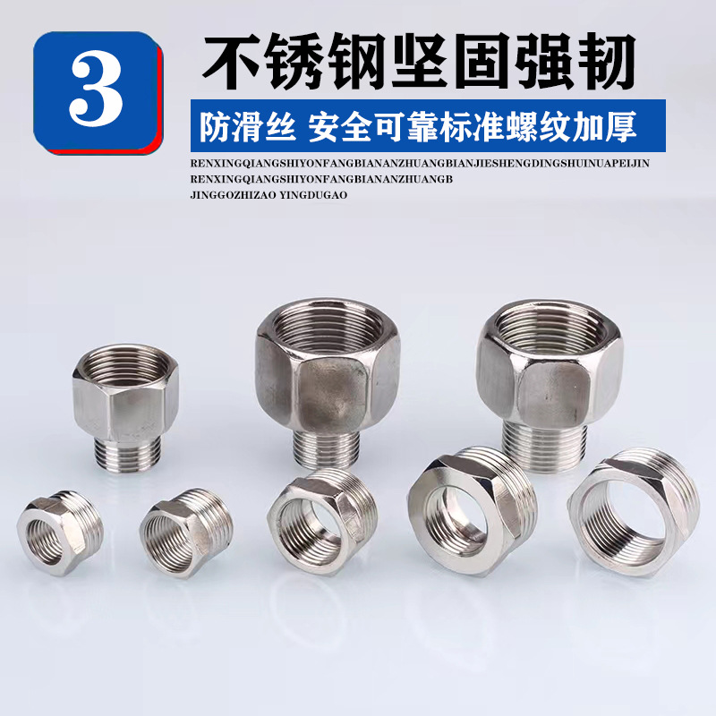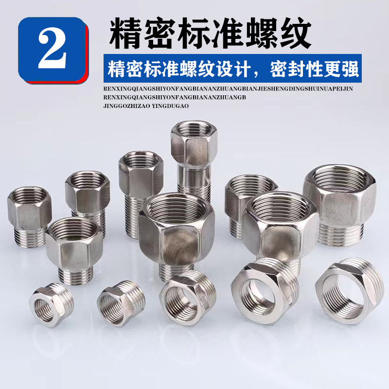 Внутренние и внешние провода из нержавеющей стали прямые. Внутренний и внешний провода из нержавеющей стали соединены с наружными и внутренними зубьями, уменьшающими соединения. Внутренняя и внешняя резьба соединены напрямую. Адаптер