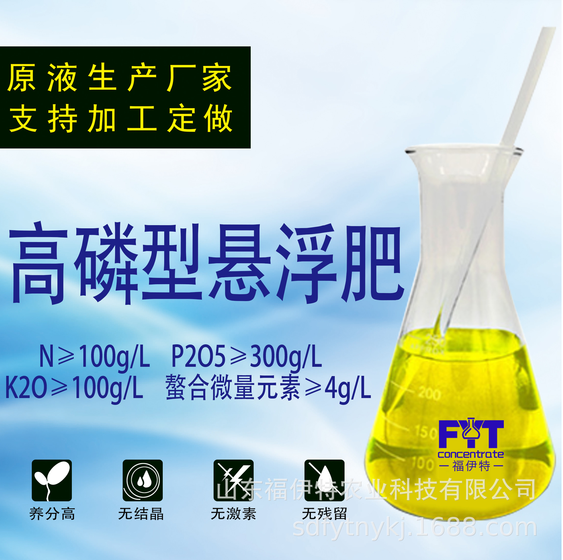 公司产品涵盖:植物遮阳剂原液、亚磷酸钾原液、聚磷酸铵溶液、糖醇系列中微量元素流体肥原液、清液大量元素水溶肥原液、海藻鱼蛋白肥原液、悬浮系列大量元素水溶肥原液、粉剂大量元素水溶肥、有机大量元素水溶肥、土壤调理等系列产品。自发研发生产的植物遮阳剂,可直接叶面喷施,有效预防“太阳果”,其他原液、粉剂大量元素等产品可根据客户需求定制。另外生产公司拥有完善的证件资源,同时拥有从公司注册到包装设计到加工生产完善的配套资源,另外企业拥有完善的技术团队,满足市场上产品差异化要求。