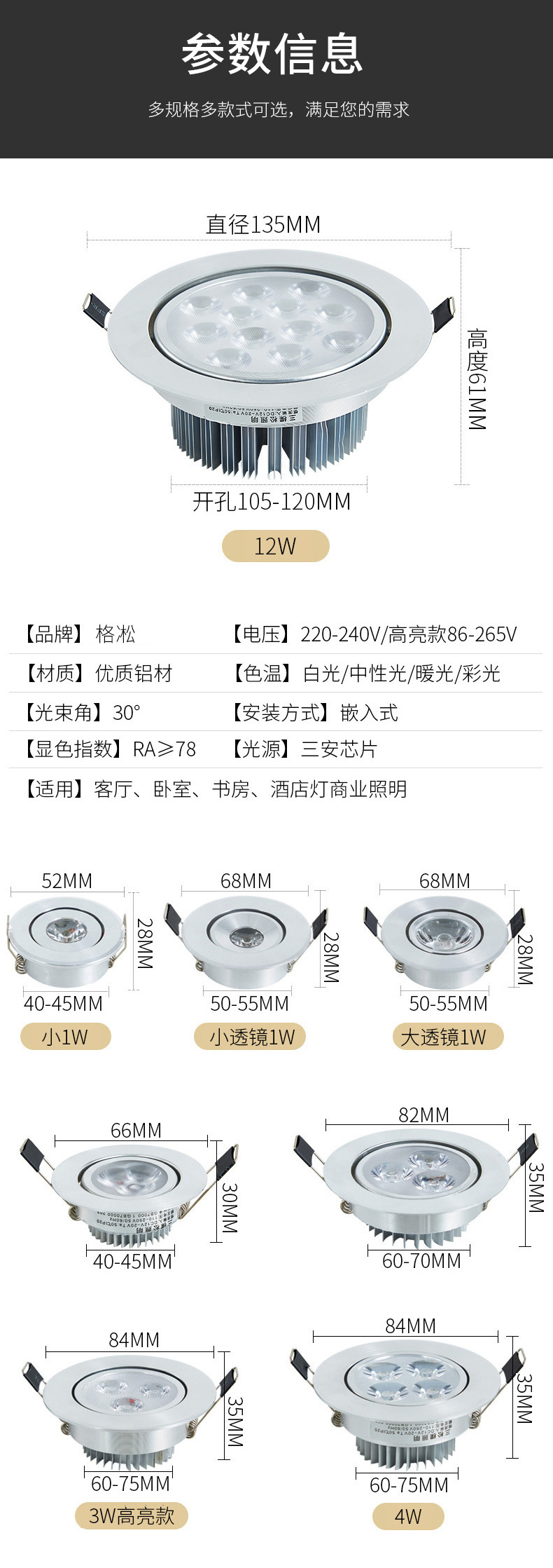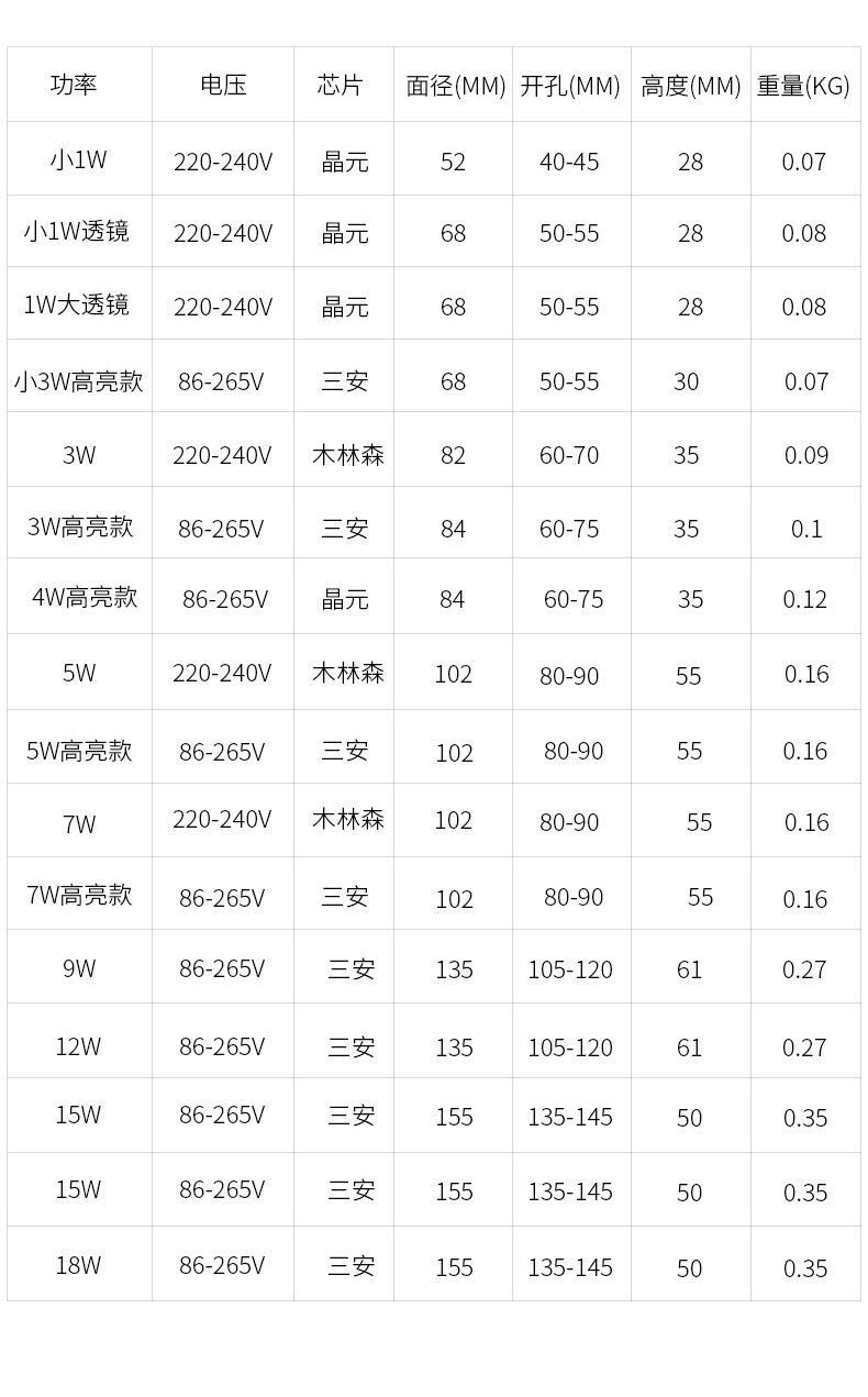 Маленький 1 Вт (отверстие 40-45); Маленькая линза 1 Вт (отверстия 50-55); Маленький 3 Вт (отверстие 50-55); Маленькая 3W подсветка для защиты глаз (отверстие 50-55); 3 Вт (отверстие 60-70); 3 Вт подсветка для защиты глаз (отверстие 60-75); Защита глаз подсветки 4 Вт (отверстие 60-75); 5 Вт (отверстия 85-90); 5W подсветка для защиты глаз (отверстие 85-90); 7 Вт (отверстия 85-90); 7W подсветка для защиты глаз (отверстие 85-90); 12 Вт (отверстия 110-120); 12 Вт подсветка для защиты глаз (отверстие 110-120); 15 Вт (отверстия 135-145); 18 Вт (отверстие 135-145); 3W окрашенный белый (отверстия 60-75); 4W окрашенный белый (отверстия 60-75); 5W окрашенный белый (отверстия 85-95); 7W окрашенный белый (отверстия 85-95); Большая линза 1 Вт (отверстие 50-55)